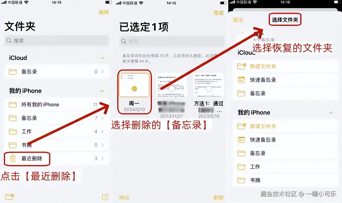 注意:【最近删除】中保存的数据是有时间限制的,超过了一定的恢复时间则无法再恢复删除的备忘录。