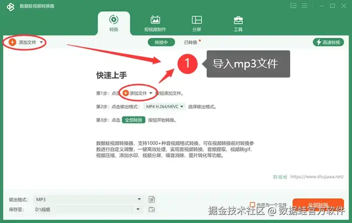第一步: 在数据 蛙的初始界面点击选择 【添加文件】 ,导入mp3音频文件。