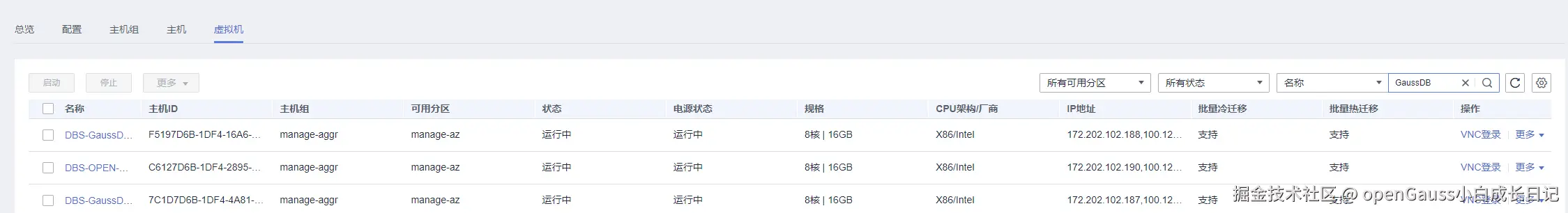 登录Service OM平台,选择“服务列表 > 资源 > 计算资源 ”,在左侧导航栏选择“可用分区 > manage-az”,在上方导航栏选择“虚拟机”,输入虚拟机名称“GaussDB”,根据引擎类型查询GaussDB管理节点IP。
