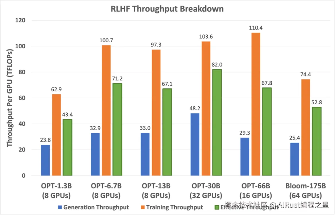在RLHF训练的经验生成阶段的推理执行过程中,DeepSpeed混合引擎使用轻量级内存管理系统来处理KV缓存和中间结果,同时使用高度优化的推理CUDA核和张量并行计算。与现有解决方案相比,DeepSpeed-HE显著提高了吞吐量(每秒token数)。