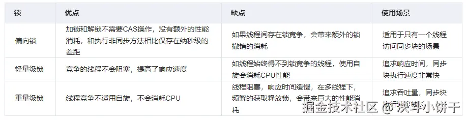 synchronized通过Monitor来实现线程同步,Monitor是依赖于底层的操作系统的Mutex Lock(互斥锁)来实现的线程同步。这种依赖于操作系统Mutex Lock所实现的锁我们称之为“重量级锁”,因此,为了减少获得锁和释放锁带来的性能消耗,引入了“偏向锁”和“轻量级锁”。