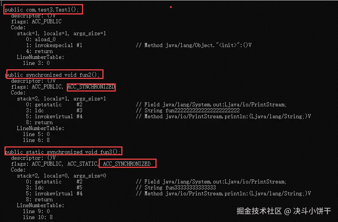 synchronized 修饰的方法并没有 monitorenter 指令和 monitorexit 指令,取得代之的确实是ACC_SYNCHRONIZED 标识,该标识指明了该方法是一个同步方法,JVM 通过该 ACC_SYNCHRONIZED 访问标志来辨别一个方法是否声明为同步方法,从而执行相应的同步调用。
