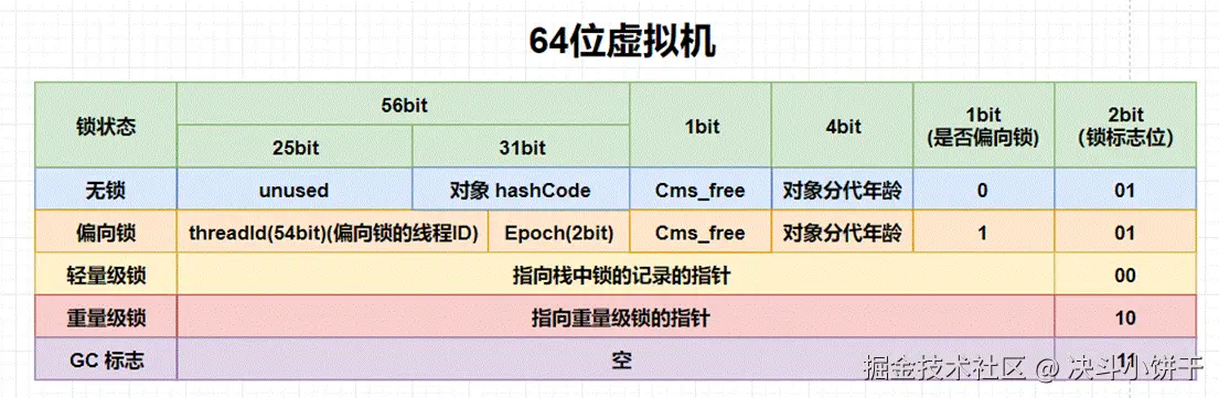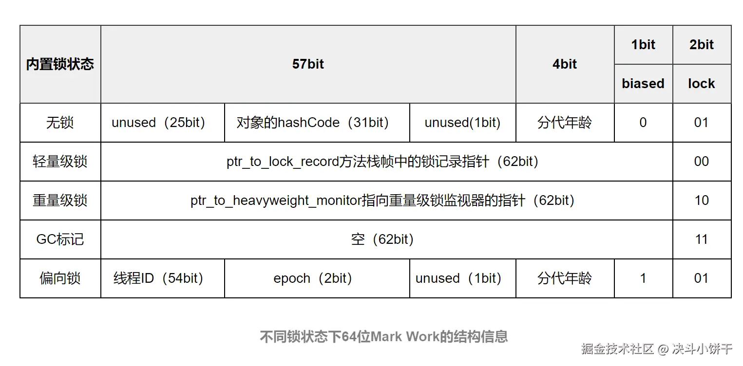 - 查看Mark Word中偏向锁的标识以及锁标志位,若是否偏向锁为1且锁标志位为01,则该锁为可偏向状态。