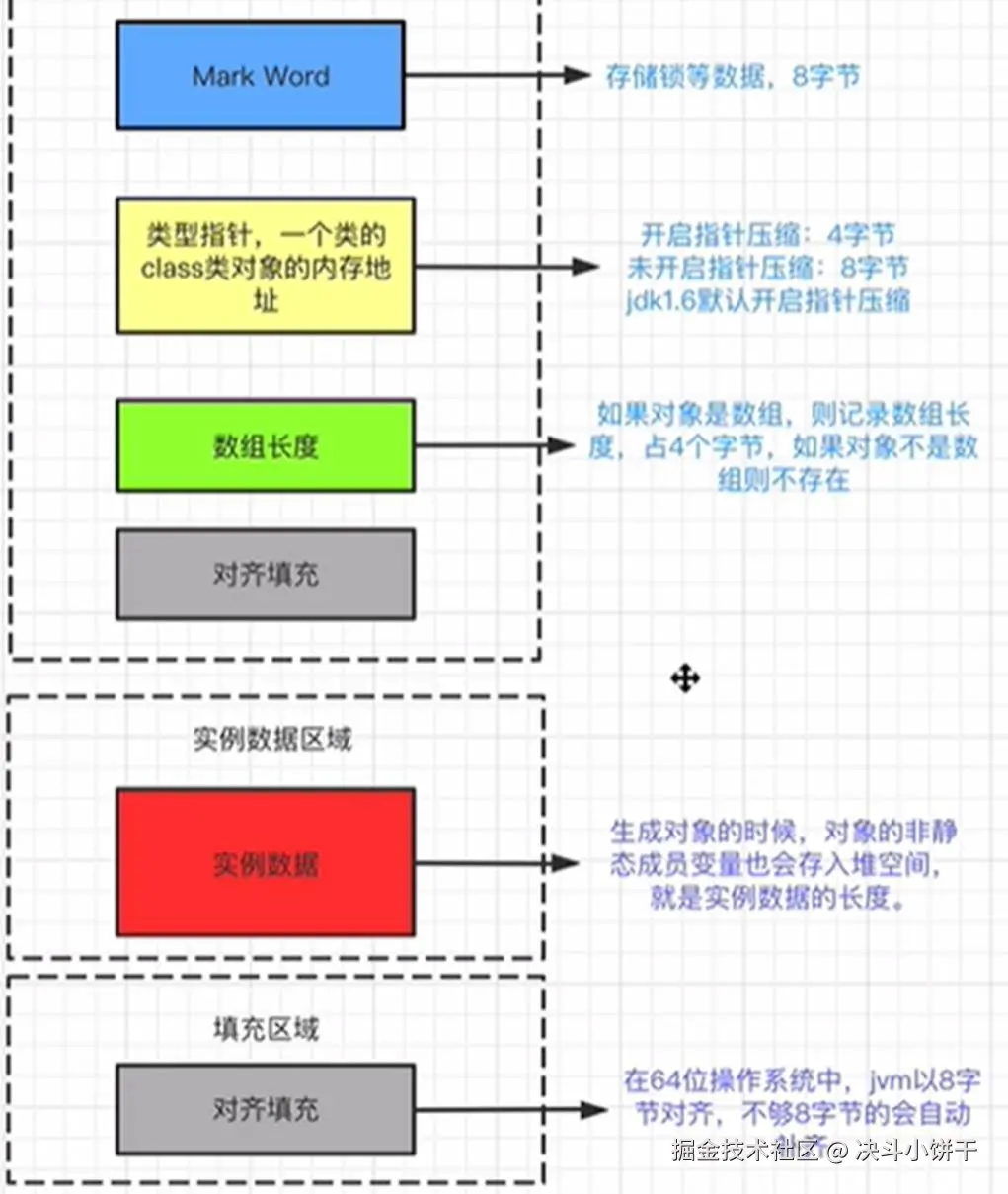 比如 hash码,对象所属的年代,对象锁,锁状态标志,偏向锁(线程)ID,偏向时间,数组长度(数组对象)等。Java对象头一般占有2个机器码(64位虚拟机中,1个机器码是8个字节,也就是64bit)。