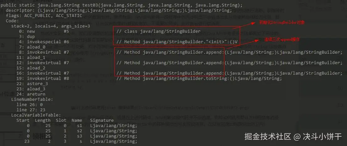 当然在实际开发中,我们很清楚的知道哪些是线程独有的,不需要加同步锁,但是在Java API中有很多方法都是加了同步的,那么此时JVM会判断这段代码是否需要加锁。如果数据并不会逃逸,则会进行锁消除。比如如下操作:在操作String类型数据时,由于String是一个不可变类,对字符串的连接操作总是通过生成的新的String对象来进行的。因此Javac编译器会对String连接做自动优化。在JDK 1.5之前会使用StringBuffer对象的连续append()操作,在JDK 1.5及以后的版本中,会转化为StringBuidler对象的连续append()操作。