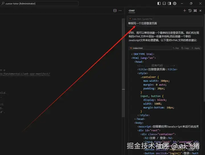 此外,Cursor 允许你将编辑器拆分为多个窗格,方便并排查看和编辑文件。例如,你可以在左侧窗口编辑 HTML 文件,右侧窗口同步编辑 CSS 或JavaScript文件。这对于多文件操作非常有用,尤其是在处理复杂项目时