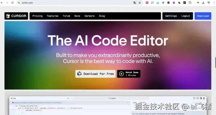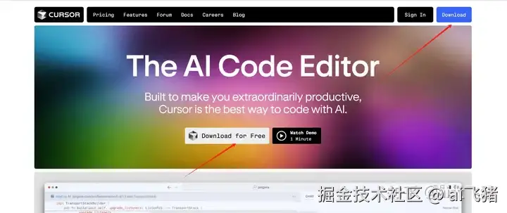 - 首先打开 Cursor 官方网站下载 Cursor 编辑器:cursor.com
