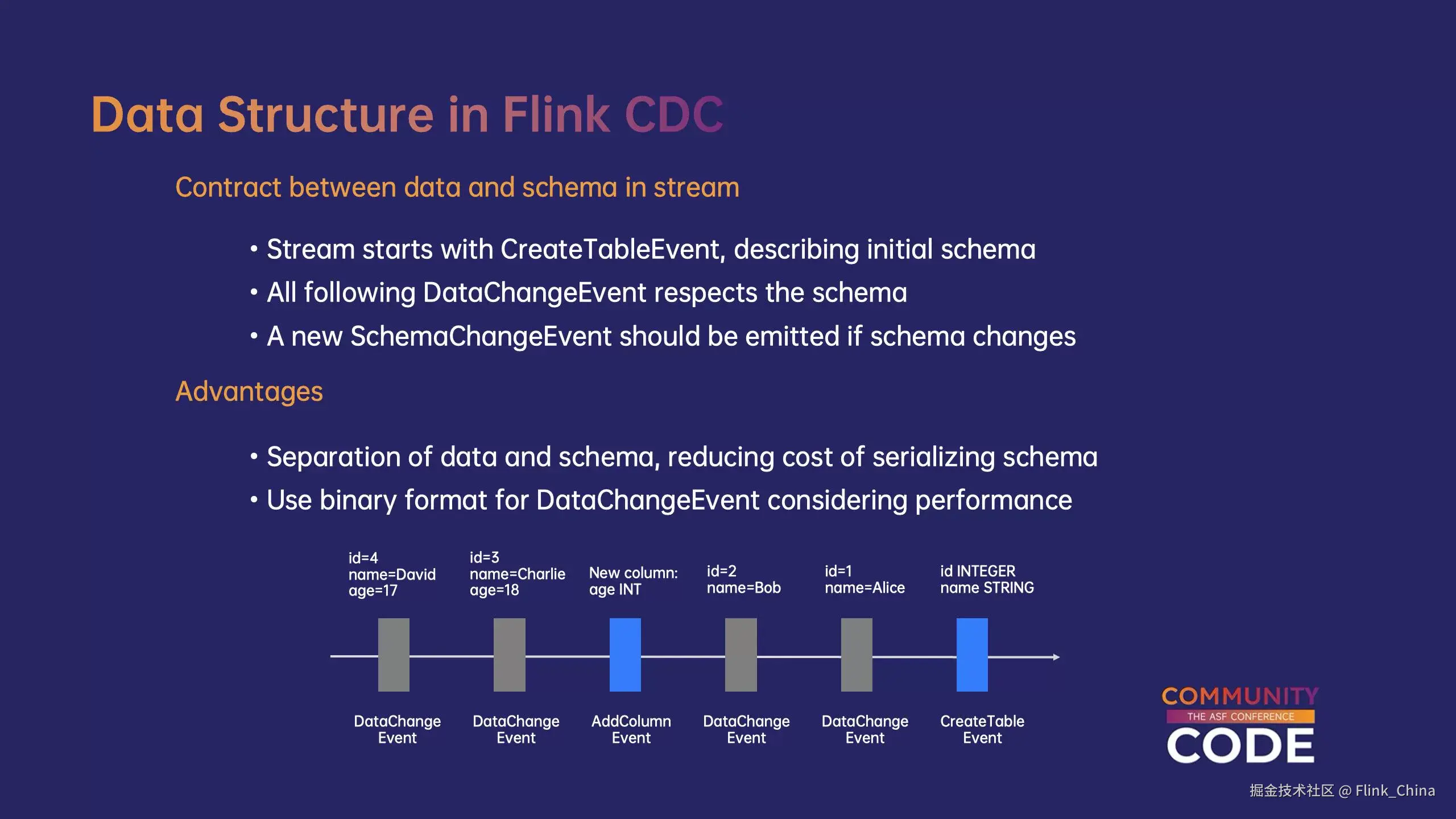 这种设计的优势在于实现了数据和 schema 的分离,大大降低了数据的序列化成本。此外 Flink CDC 为数据变更事件使用了压缩的二进制格式,进一步提升了性能。
