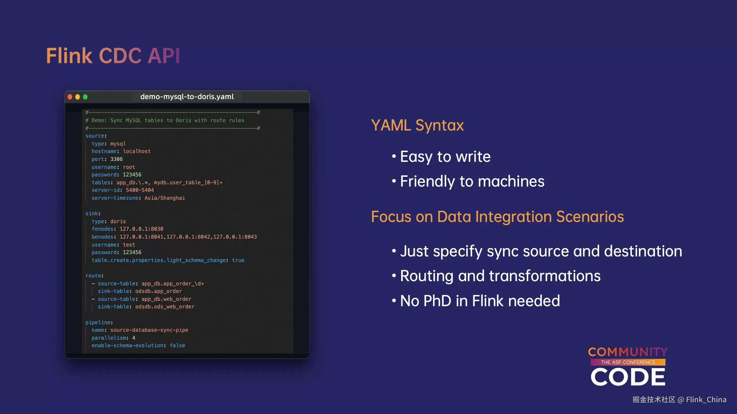 Flink CDC API 使用 YAML 语法定义数据同步任务,即易于开发者进行手动开发,又可以高效地使用机器进行处理。YAML API 针对数据集成场景设计,用户只需定义同步数据源和数据目标端即可快速搭建起一个实时同步流水线。此外用户还可以在 YAML 中定义 routing 和 transformation 实现自定义数据分发和变换。用户不再需要熟练掌握 Flink 作业开发与内部实现,即可使用 Flink CDC 搭建实时数据集成流水线。