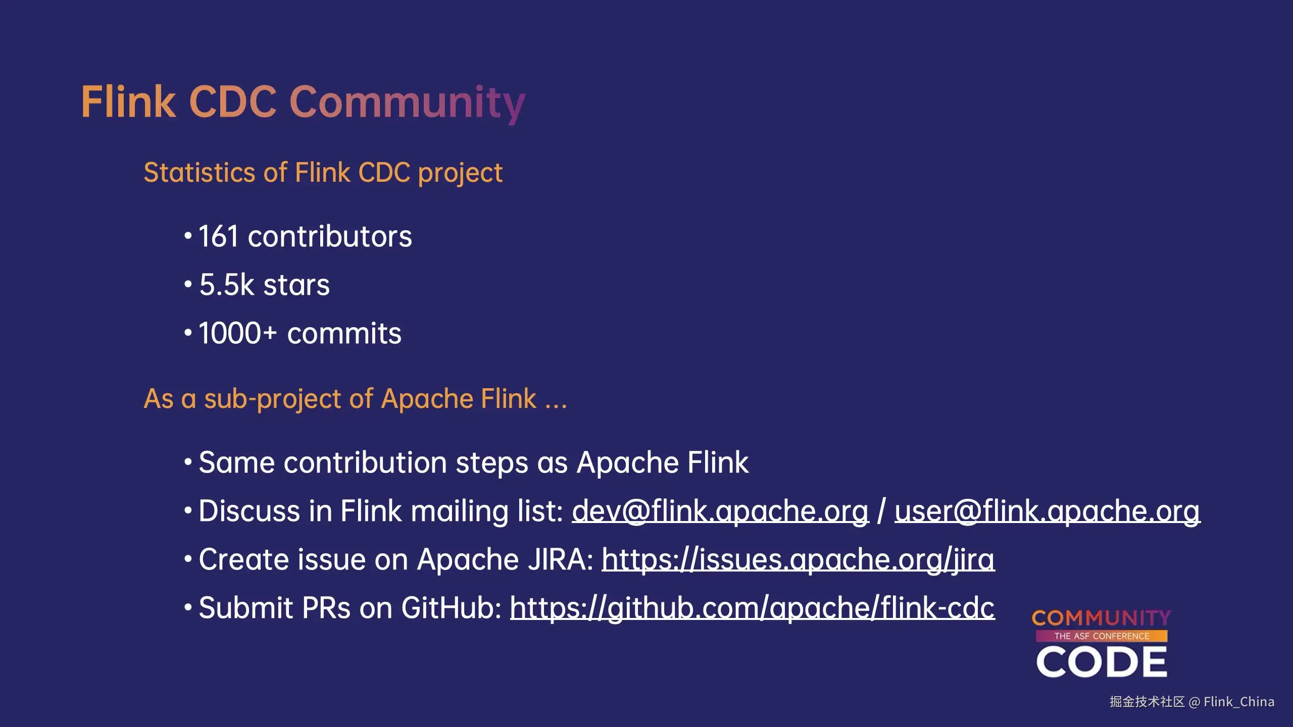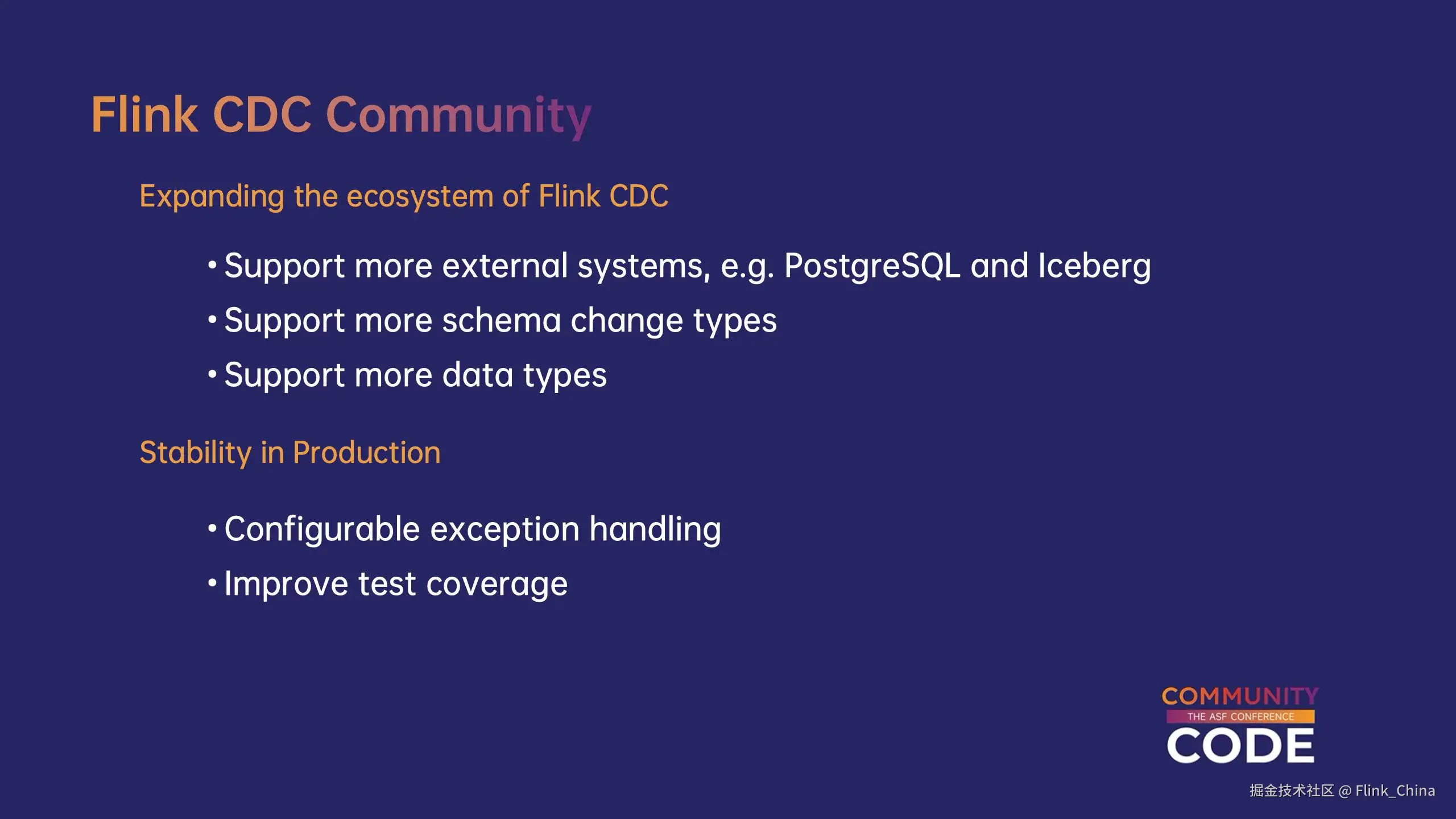目前 Flink CDC 已经有超过 160 位贡献者,项目获得 5k+ star,1000+ commit。未来 Flink CDC 将着力于扩展生态,对接至更多的外部系统,如 PostgreSQL、Iceberg 等,并且将支持更多的 schema 变更类型和数据类型。另外 Flink CDC 也会持续提升生产稳定性,包括对异常处理方式进行自定义配置、提升测试覆盖等等。作为 Apache Flink 的子项目,Flink CDC 使用与 Flink 一致的贡献流程。欢迎各位用户和贡献者在 Flink 邮件列表中咨询和讨论,使用 Apache JIRA 创建 issue,在 GitHub 上提交 PR!