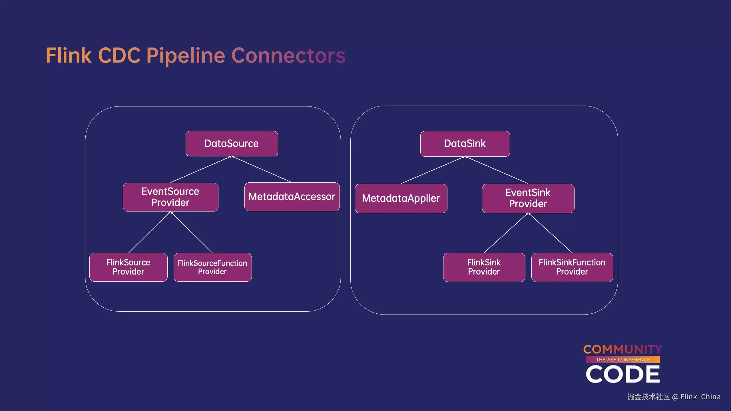 Flink CDC 定义了自己的数据源和目标端连接器的接口,以适配 Flink CDC 内部的数据结构。Flink CDC pipeline connector 基于 Flink connector,只需进行简单的数据转换封装,即可快速复用现有的 Flink connector,将其对接到 Flink CDC 生态系统中。为了实现 schema 变更处理能力,Flink CDC 定义了 MetadataAccessor 和 MetadataApplier,分别对源端和目标端的 schema 等元信息进行获取和处理,实现 schema 变更的实时同步。