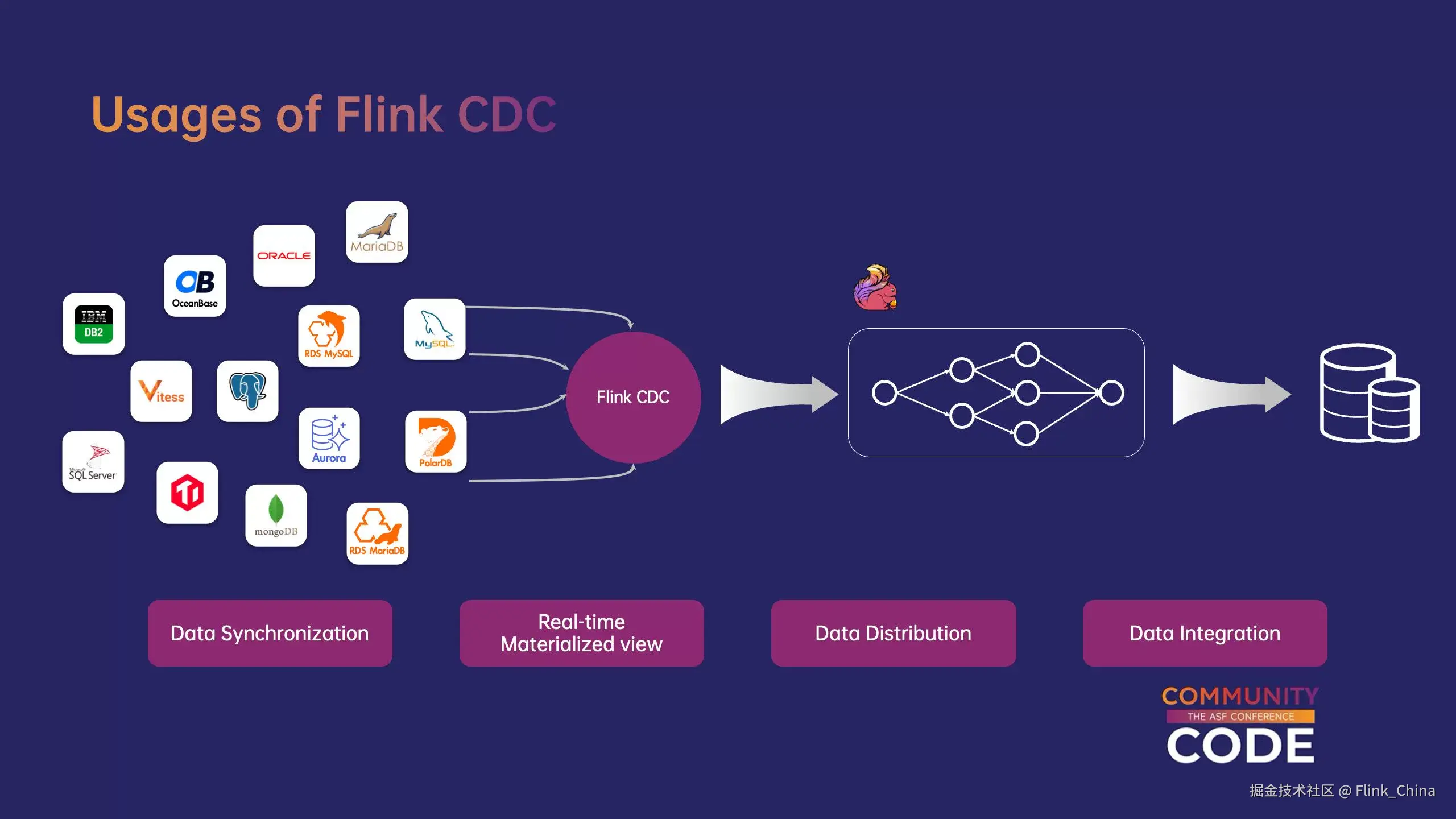 Flink CDC 可以应用在多种场景中。比如数据同步,可以将上游数据库中的数据同步至下游数据仓库、数据湖等。用户还可以借助 Flink CDC source 实现实时物化视图,结合下游 Flink 作业处理逻辑实现更丰富的业务场景。此外用户还可以使用 Flink CDC 捕获的变更数据基于业务逻辑进行数据分发。