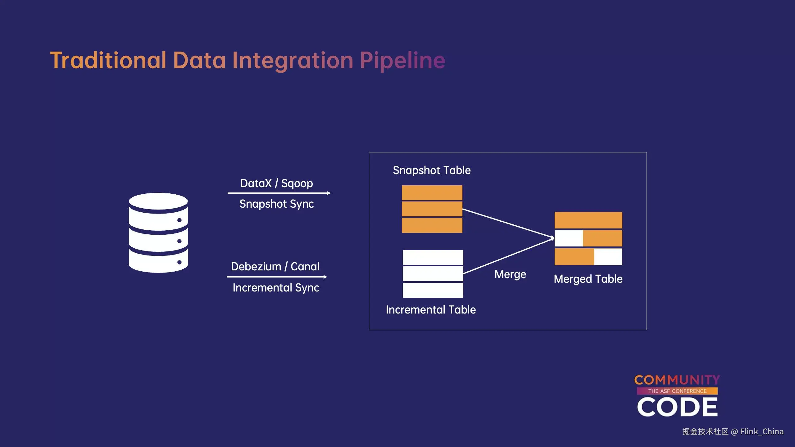 一个传统的数据集成流水线通常由两套系统构成:全量同步和增量同步。其中全量同步会使用 DataX、Sqoop 等系统,增量同步需要使用另外一套系统,如 Debezium、Canal 等等。在全量同步完成后,可能还需要额外的一步合并操作将增量表和全量表进行合并,最终得到与上游一致的快照。这种架构的组件构成较为复杂,为系统维护带来了很多困难。