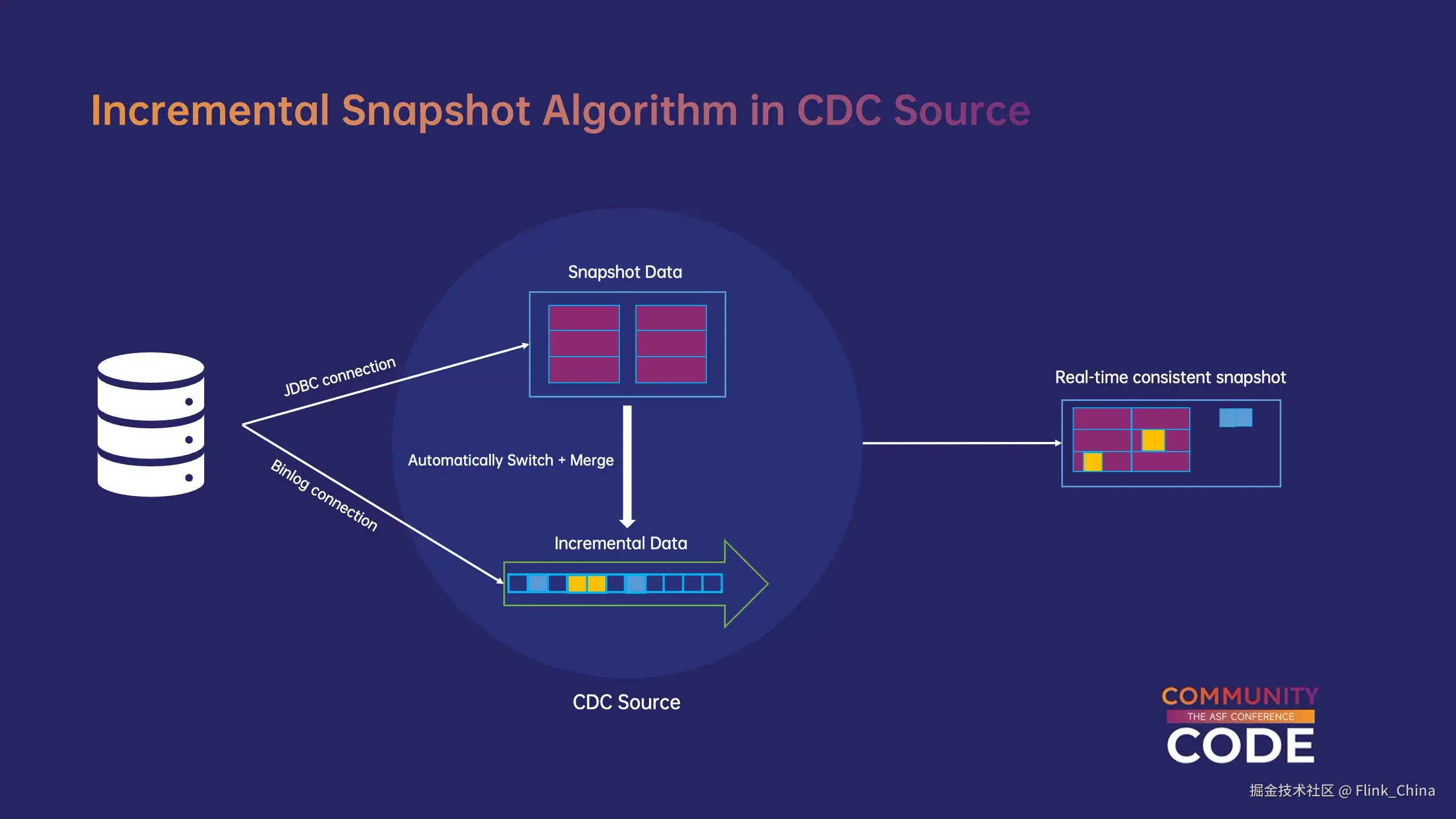 为了实现全量和增量的一体化同步,Flink CDC source 使用增量快照算法,既实现了全增量同步的无缝切换,而且采用了无锁设计,避免全量同步时的锁表动作对上游业务的影响。在增量快照算法中,数据库的全量数据被切分为独立的数据块(chunk),分发给 source 的各个并发进行读取。考虑到在全量读取过程中数据还有可能发生变化,在开始读取前,source 将 binlog 的当前位点记为低水位线(low watermark),在全量读取结束后再次将 binlog 最新位点记录为高水位线(high watermark),随后读取高、低水位线之间的变更数据,将其合并到已读取的全量数据块中,从而构建一个与上游完全一致的数据块。在完成全部数据块的读取之后,source 会根据记录的高水位线确定切换位点,实现全量和增量的无缝切换。