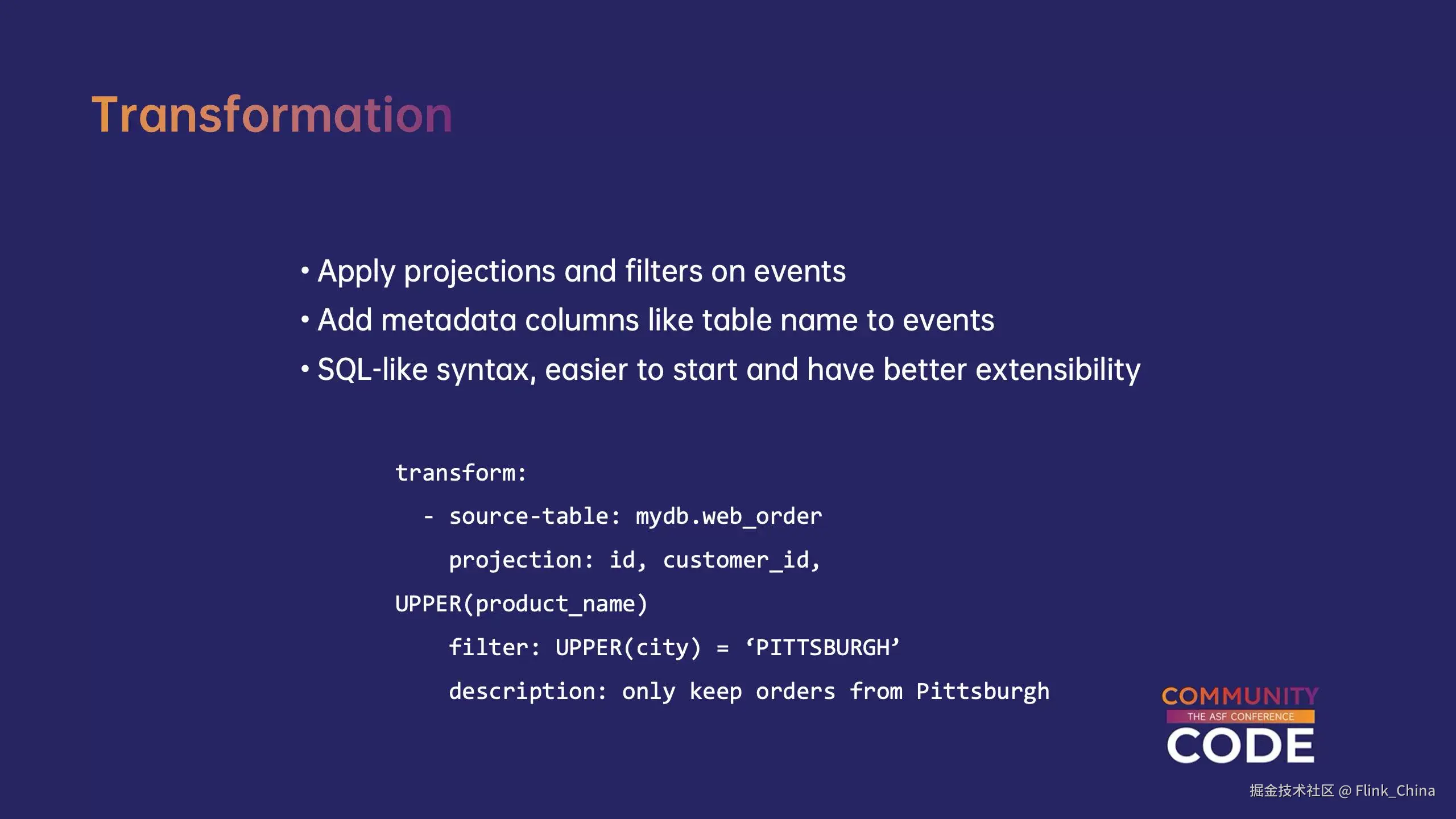 通过在 YAML 中使用 transform 字段,用户可以在数据流上定义投影、过滤、增加元信息列等数据变换操作,调整数据内容后同步至下游。transform 使用类 SQL 语法,既可以让用户简单上手开发,又保留了对更多类型变换支持的可扩展性。