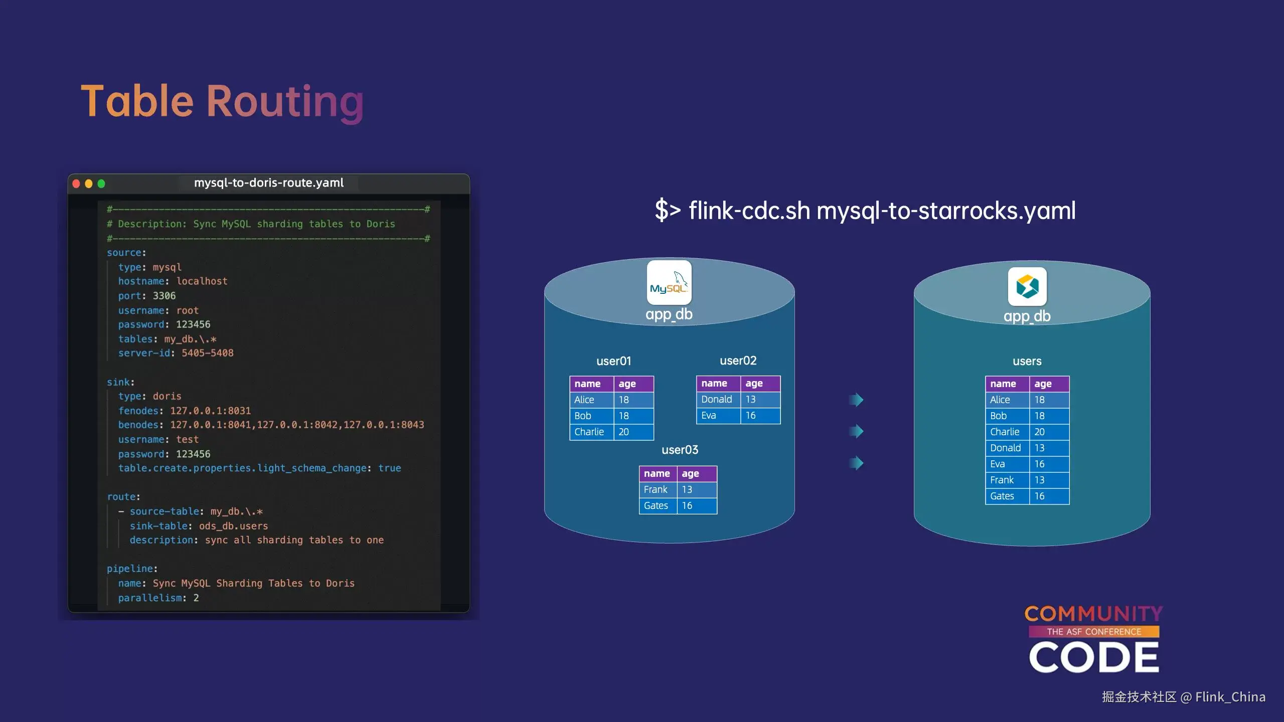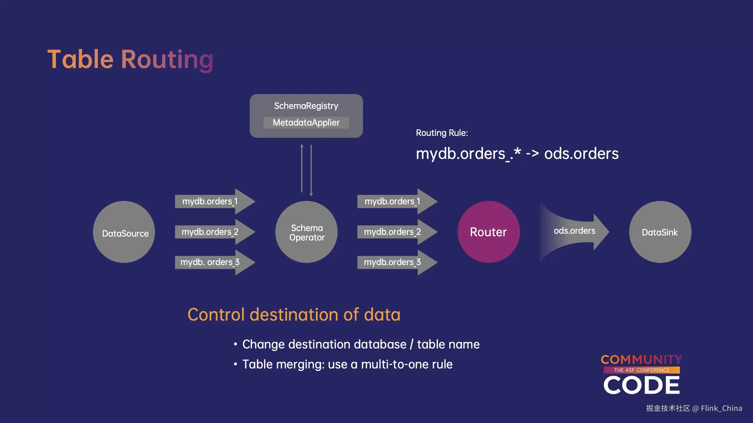 Flink CDC 定制了 router 算子,实现对变更数据的分发和合并。用户可以在 YAML 中使用 route 字段修改变更数据的目标数据库和表名,将数据同步至指定目标端,同样也可以通过指定多对一的路由规则,将多个表合并为目标端中的一张表。
