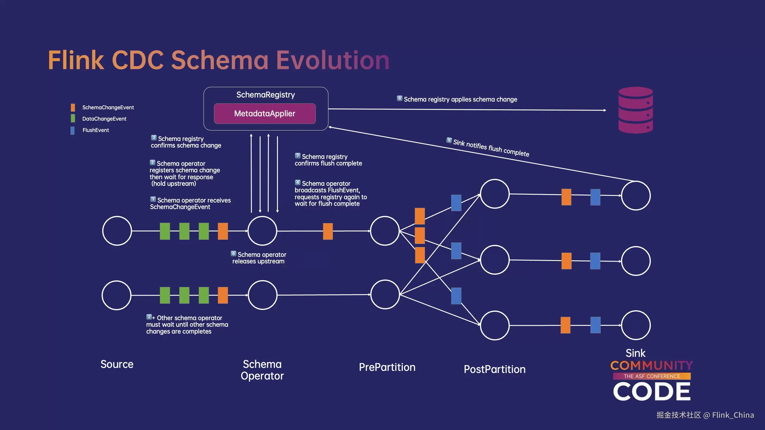 当 schema 发生变更时,需要在数据流中发送一个新的 SchemaChangeEvent 以描述 schema 变化
