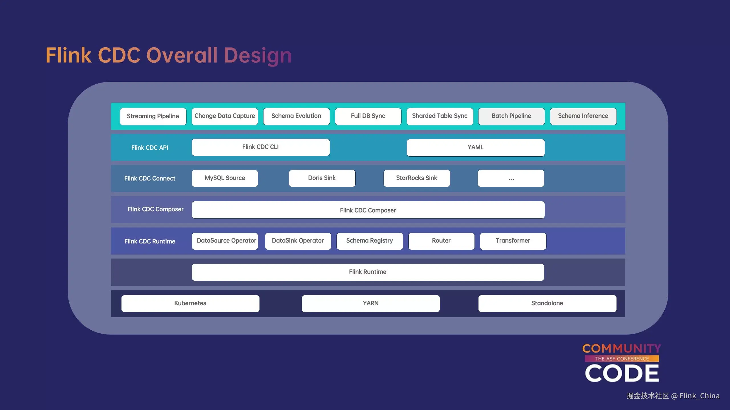 Flink CDC 基于 Flink runtime 实现,因此可以充分复用 Flink 的资源管理和在不同环境上部署的能力。针对各种数据集成场景,Flink CDC 深度定制了多种自定义算子,如 schema operator、router、transformer 等。为了将不同的算子进行协调和组合,Flink CDC 引入了 composer 组件,可根据用户定义的数据同步逻辑构建 Flink 作业。依托于 Flink 丰富的生态系统,开发者只需简单地封装即可快速将现有的 Flink connector 对接至 Flink CDC。此外 Flink 还提供了 CLI,只需一个脚本即可将用户的 YAML 定义使用 composer 构建成 Flink 作业,并提交至指定 Flink 集群。基于以上架构,Flink CDC 为数据集成用户提供 schema 变更同步、整库同步、分库分表同步等增强能力。
