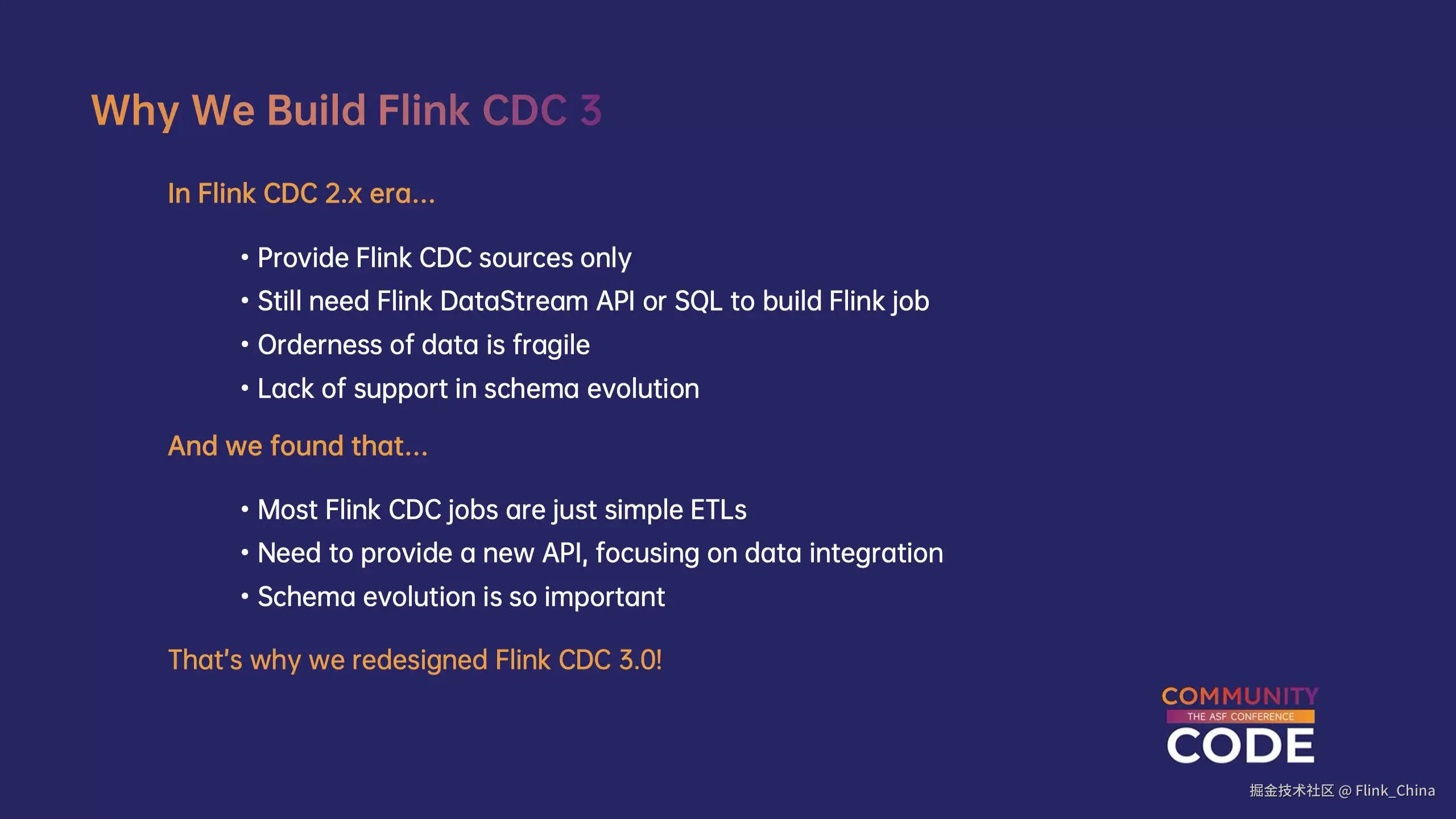 在 Flink CDC 2.x 的时代,Flink CDC 只提供一些 Flink source,用户仍然需要自己开发 Flink DataStream 或 SQL 作业实现数据同步逻辑。如果用户对 Flink 不够熟悉,经常会遇到棘手的数据正确性和乱序问题。此外 Flink CDC 2.x 不支持 schema 变更,而 schema 变更是用户的业务系统中很常见而且很重要的场景。通过对用户使用场景的调研,我们发现绝大多数使用 Flink CDC 的作业都是较为简单的数据 ETL。结合上述问题,我们决定为用户提供一个全新的框架,设计一套全新的 API,专注于数据同步场景。