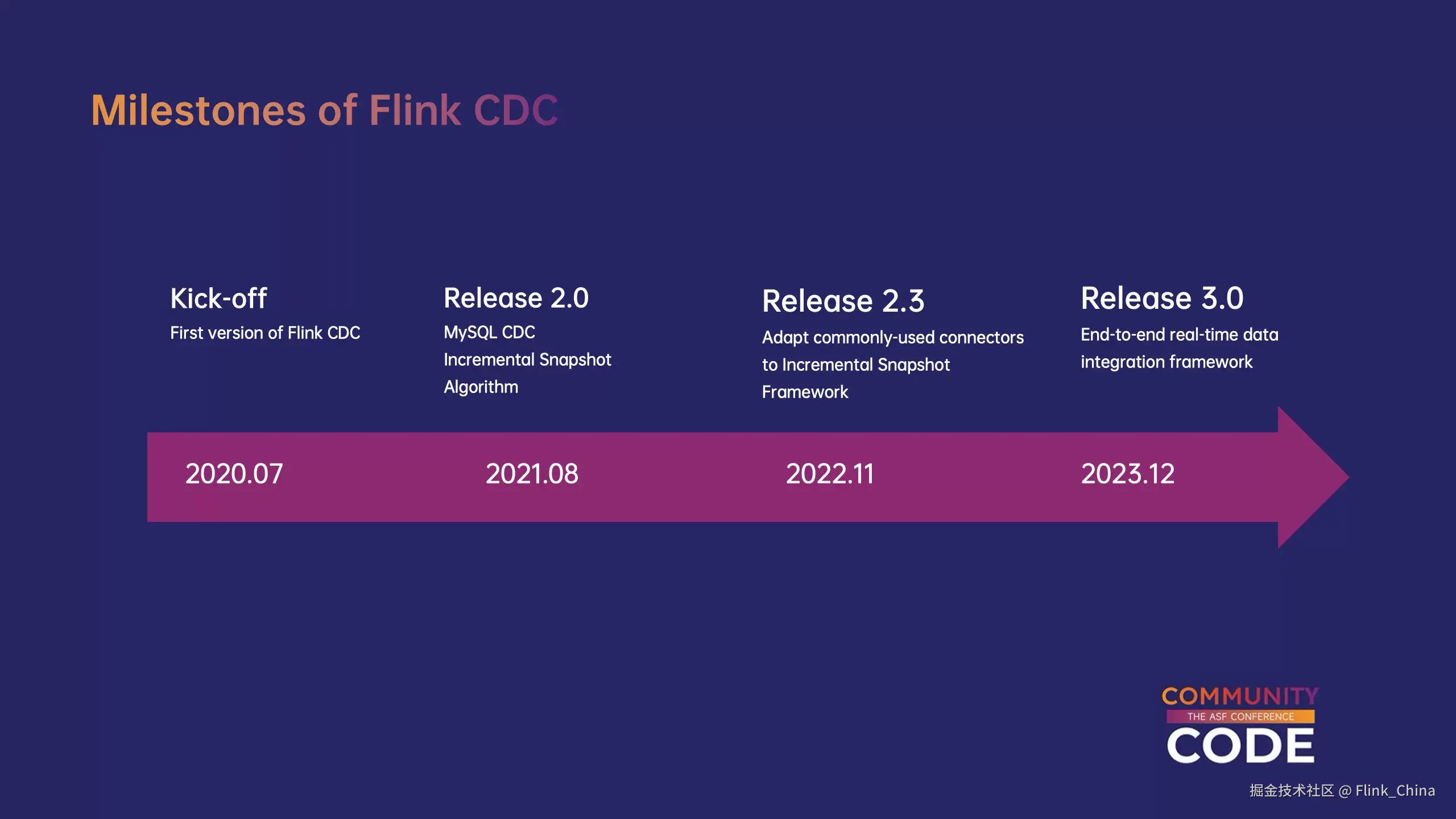 Flink CDC 诞生于 2020 年 7 月,中间经过不断迭代优化,发布了多个大版本。2021 年 8 月,Flink CDC 发布了 2.0 版本,首次为 MySQL CDC source 引入增量快照算法,实现了全增量同步无缝切换。2022 年 11 月,Flink CDC 发布 2.3 版本,将大多数 connector 对接至增量快照框架。2023 年 12 月,Flink CDC 推出 3.0 版本,正式将 Flink CDC 项目升级为实时数据集成框架,提供 YAML API,为数据同步提供端到端解决方案。