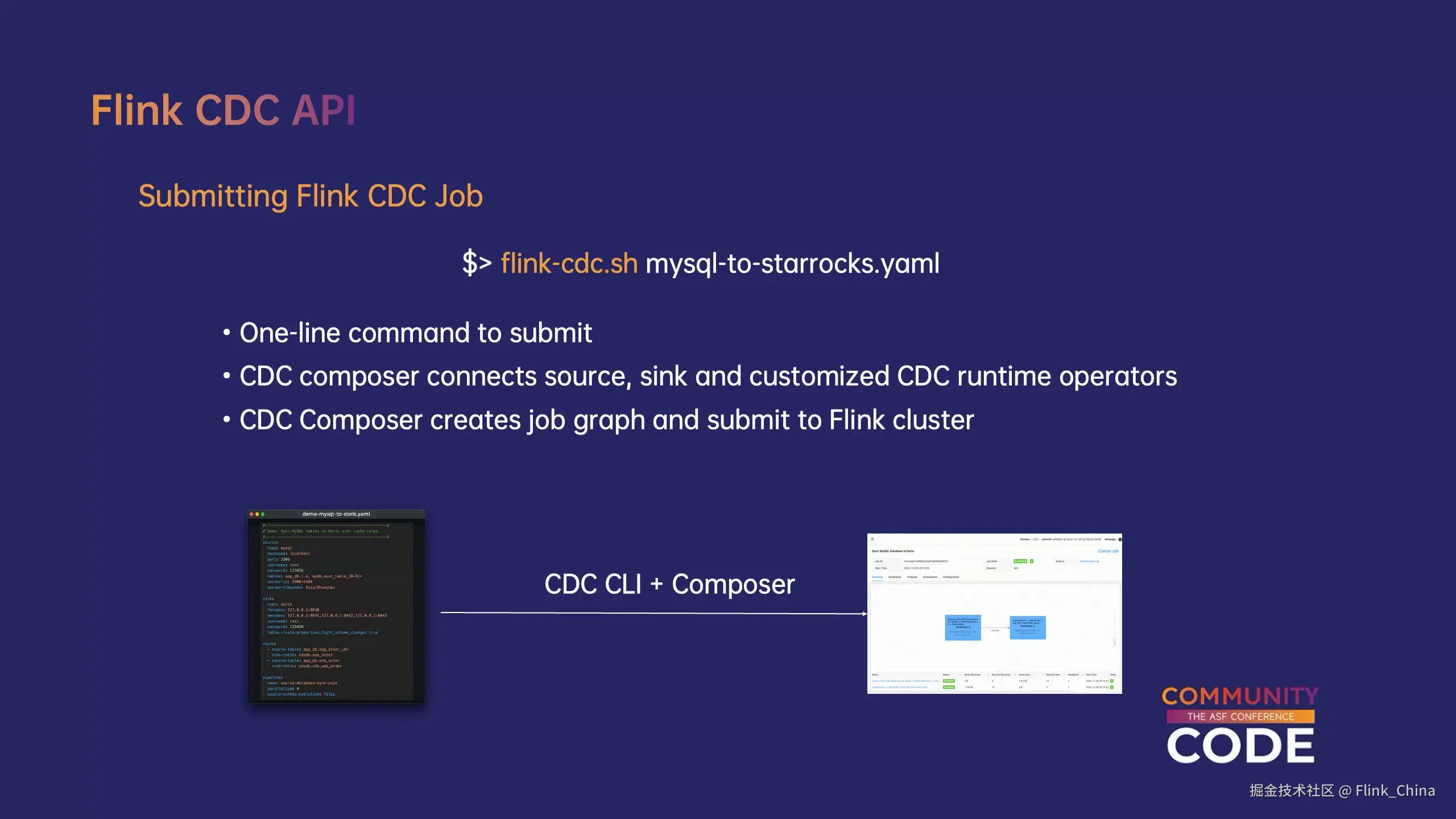 Flink CDC 提供的 CLI(flink-cdc.sh)进一步简化了用户提交 Flink CDC 任务的流程。用户只需执行一行命令,CDC composer 会将 source、sink、自定义 CDC runtime 构建成 Flink 任务,创建 Flink JobGraph 后提交至 Flink 集群。