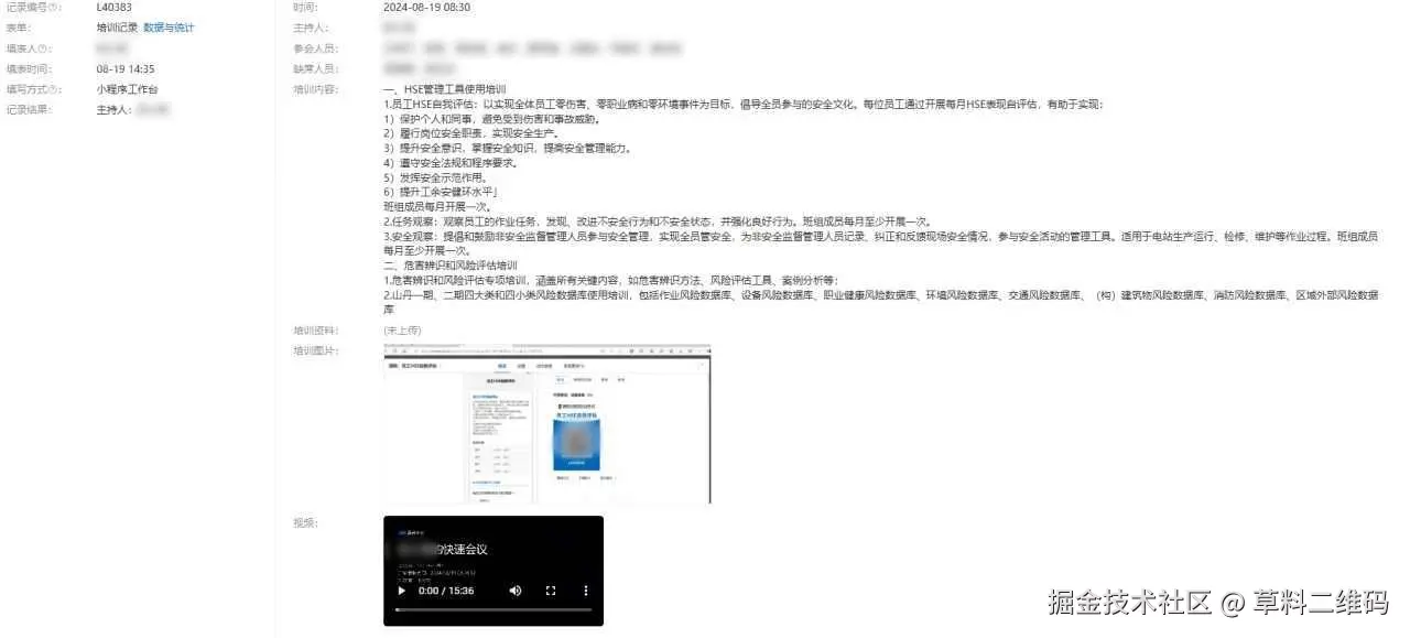 (3)培训记录:安全培训是班组工作的重要环节。二维码可以用于记录员工的安全培训经历。每位员工可通过扫描二维码查看班组的培训记录,包括培训内容、时间。这种方式不仅方便员工自我检索,也便于管理层对安全培训的监督和管理,确保每位员工都能及时了解安全要求和政策。