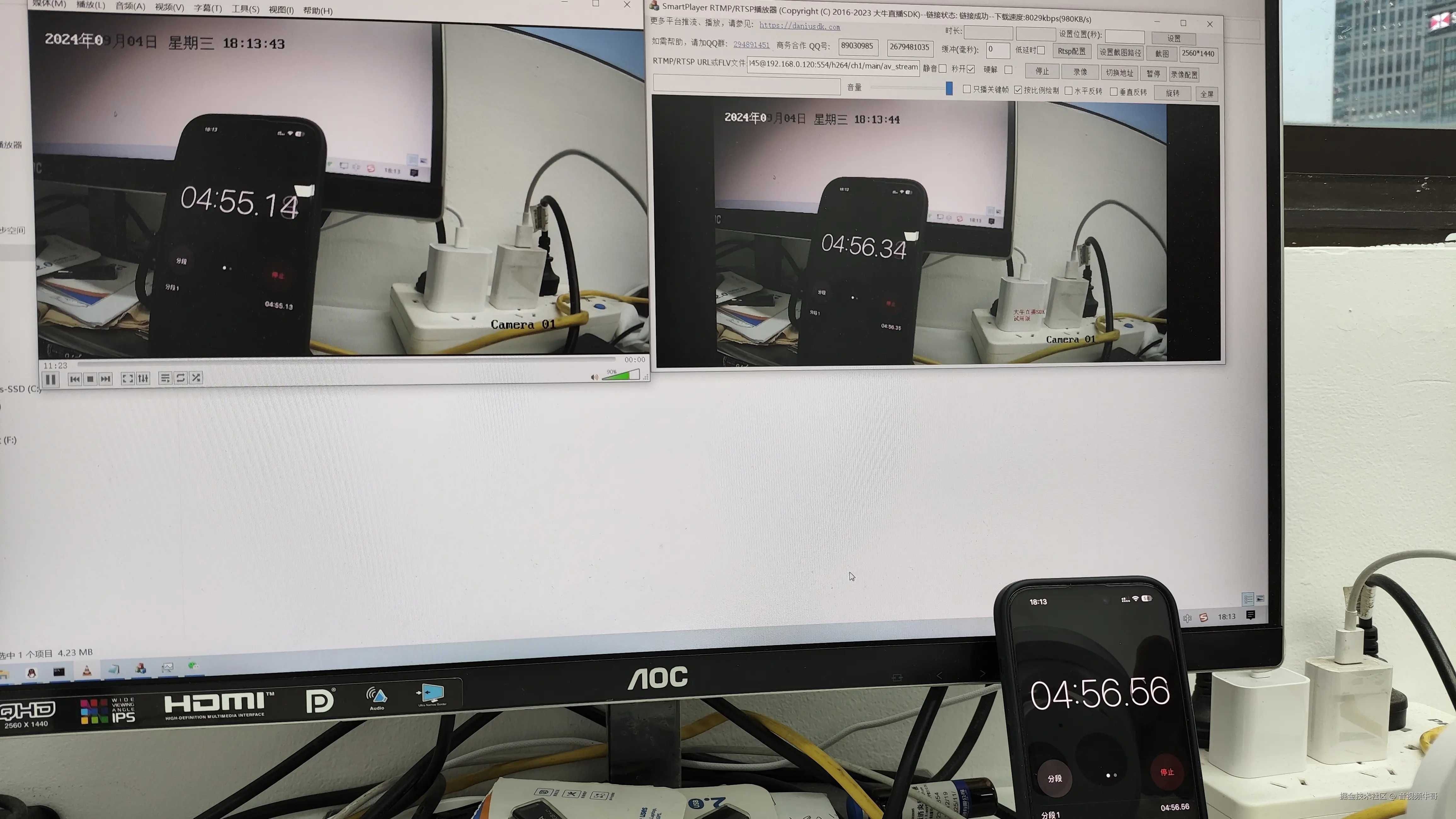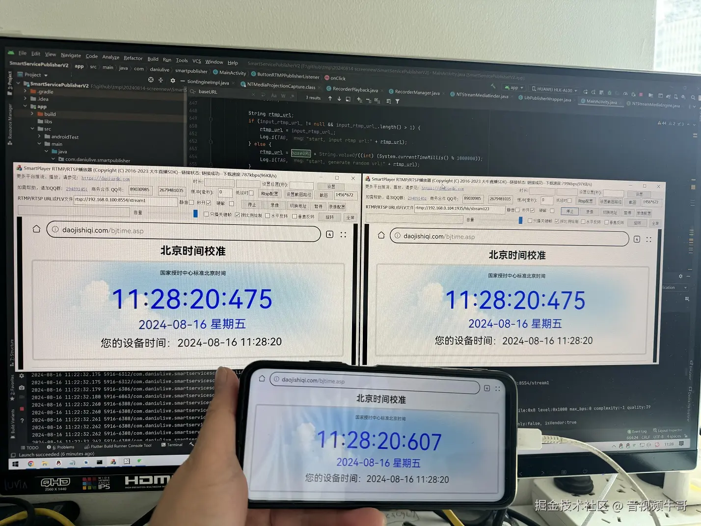 以大牛直播SDK的模块为例,Android平台分别为启动了轻量级RTSP服务,和RTMP推流,Windows分别播放RTSP和RTMP流,延迟效果如下。