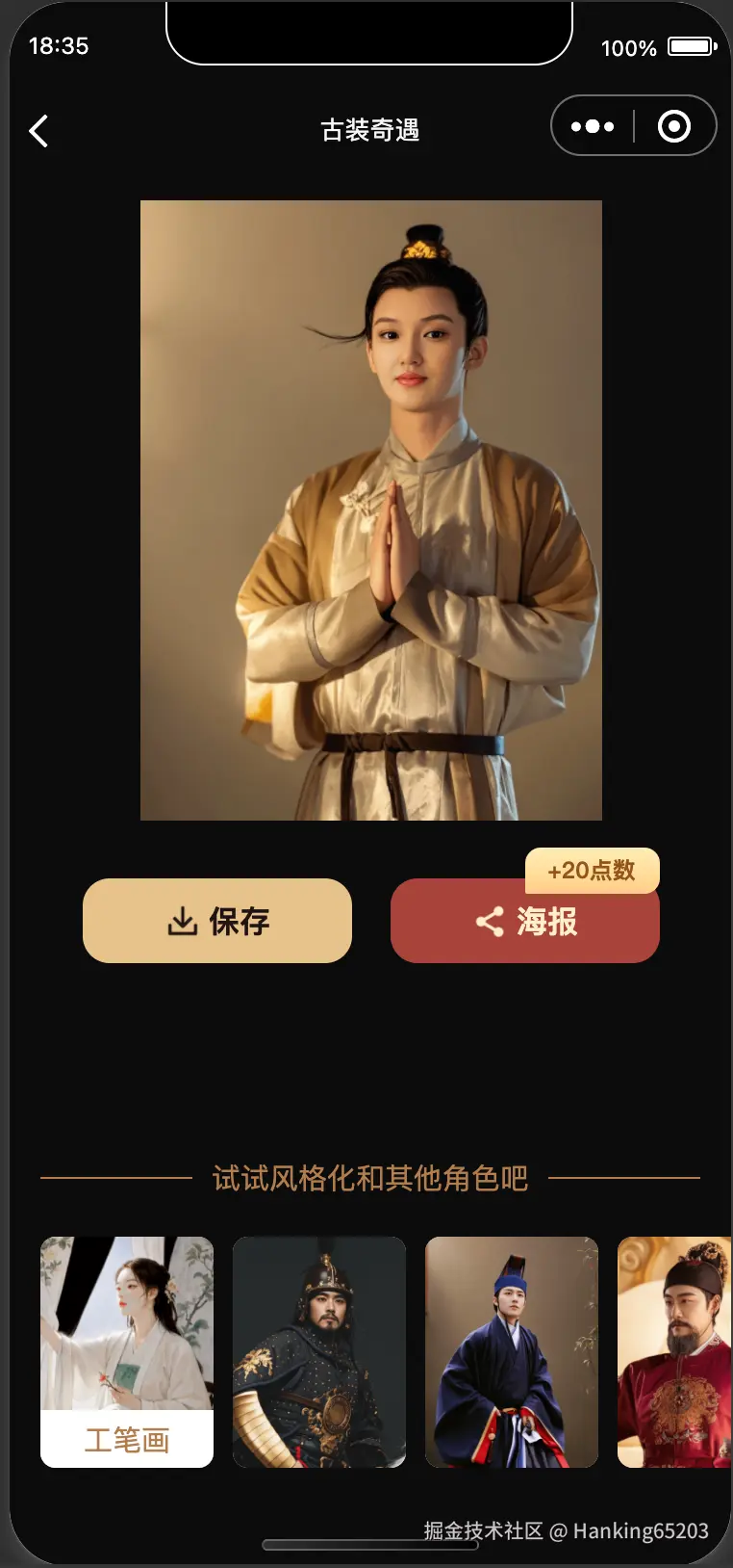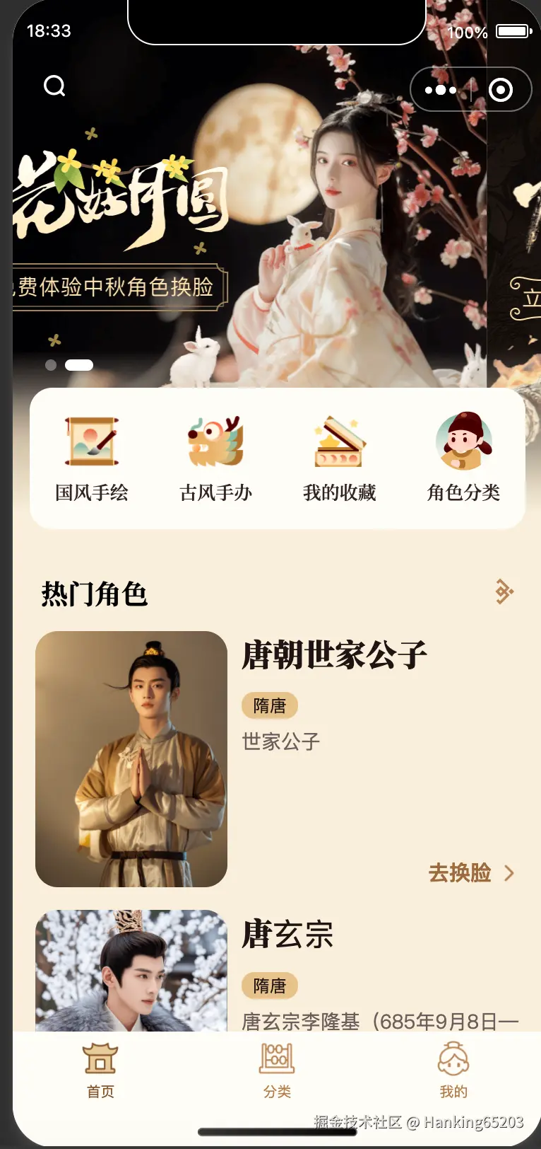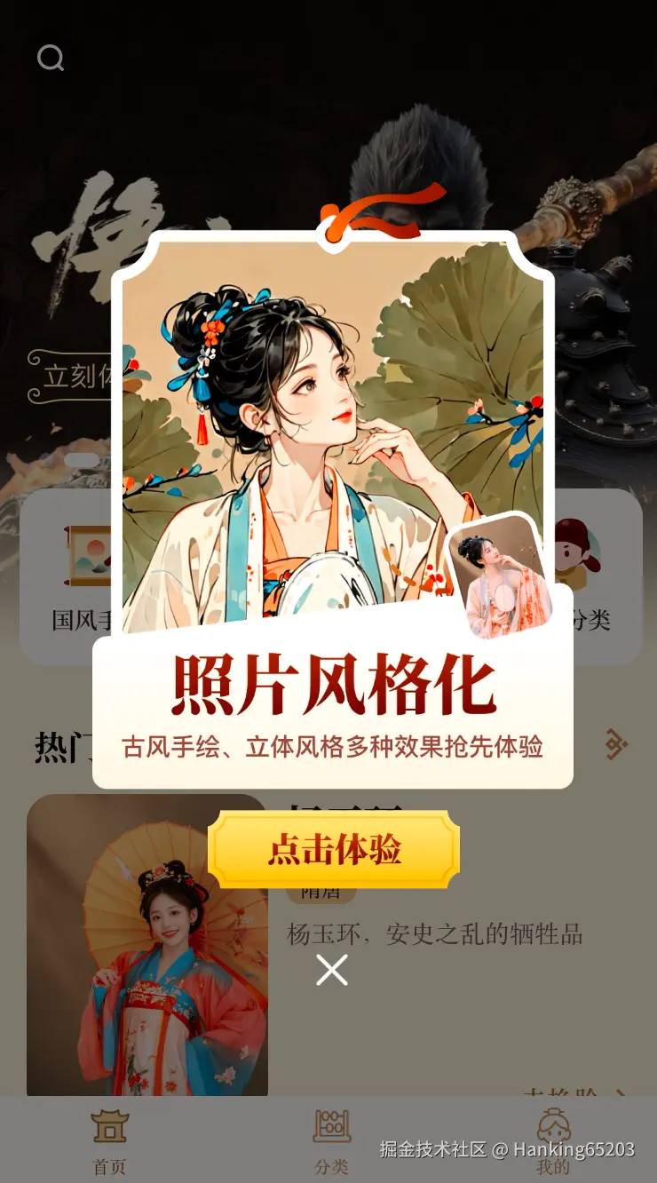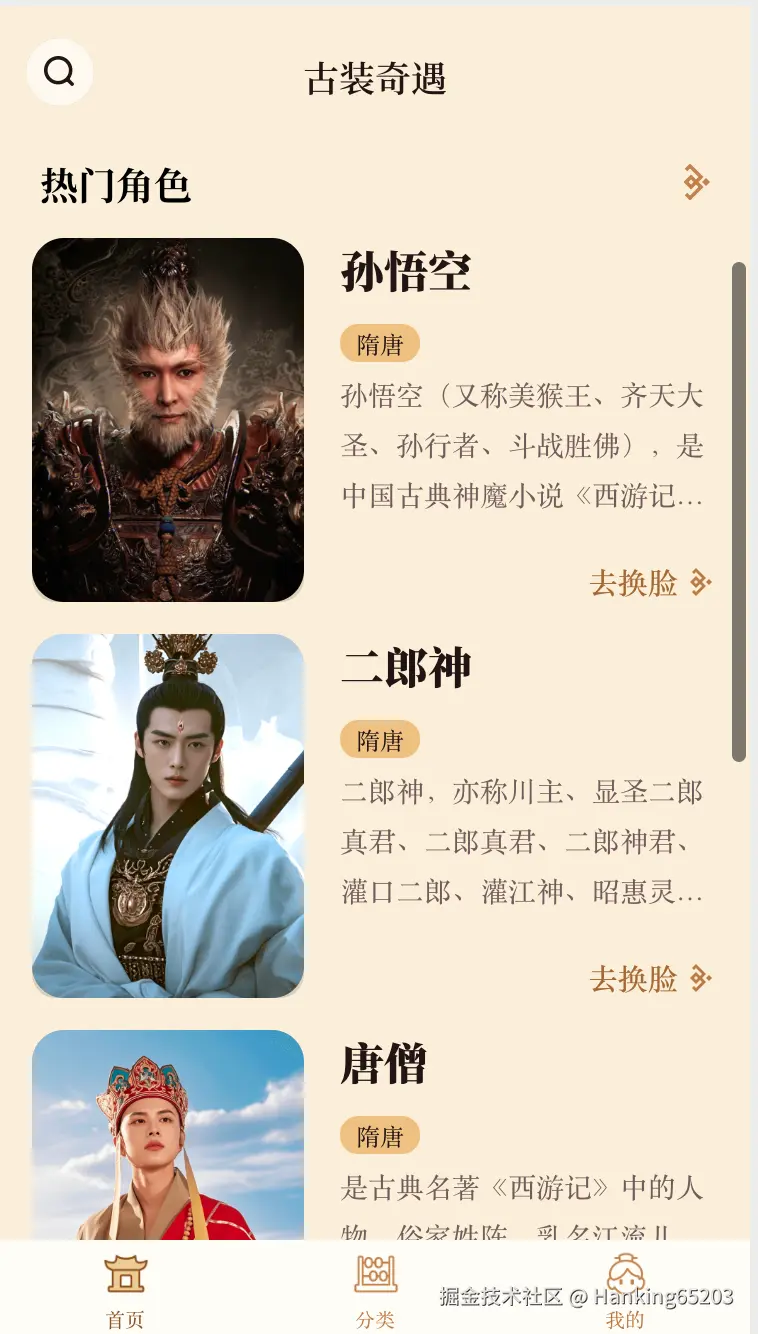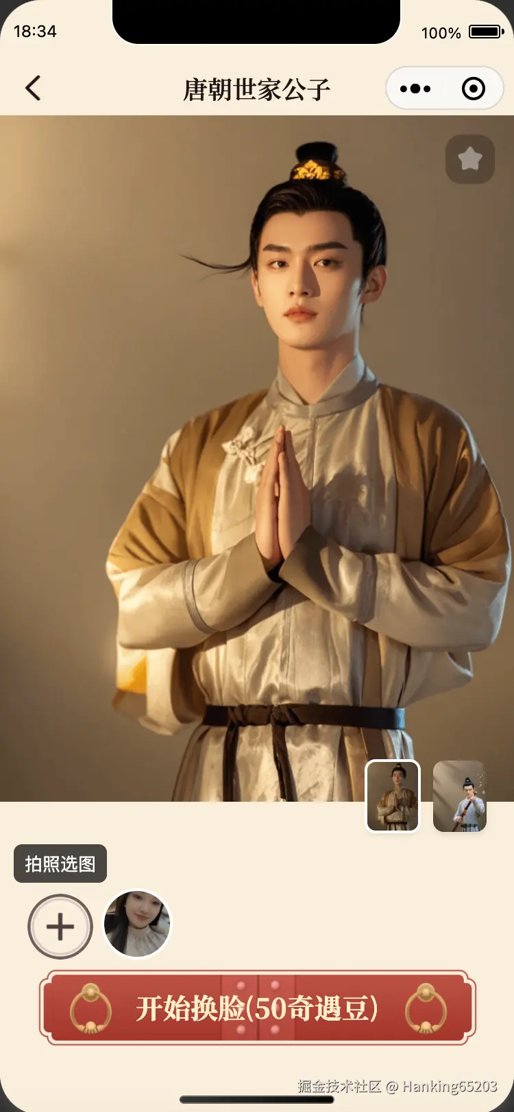 一直以来对中国传统文化感兴趣,特别是对汉服挺感兴趣的,但是又舍不得钱自己去买汉服穿,想着要是能结合AI能力,让自己或者朋友能很方便的体验到穿汉服的乐趣那该多好。怎么才能让别人很方便的体验到汉服呢?首先想到的是用AI的换脸技术,先找到一批/生成一批中国各个朝代的底图,然后一键换上自己的脸。