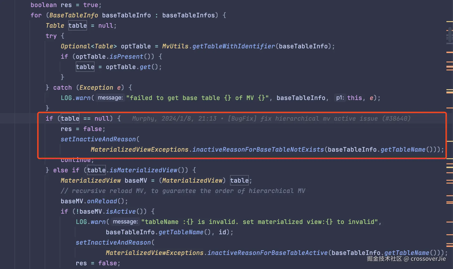 从这个代码可以看出,是在查询表的信息的时候没有查到,从而导致日志打印 base-table 被 dropped 了。