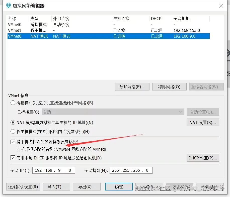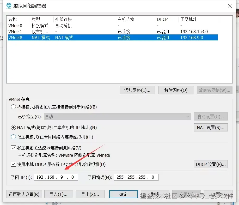 选择 VMnet8 ,子网ip改成 192.168.9.0 然后点击确定。