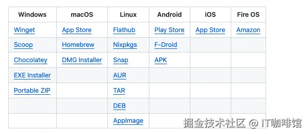 - 跨平台款跨平台应用,支持的平台包括windows、mac、Linux、ios、安卓等,为了方便找到对应的安装途径,项目还专门提供了列表。