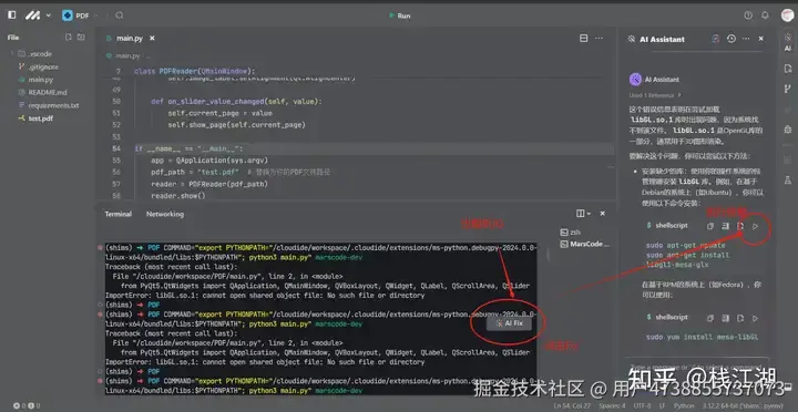当运行程序出现bug后,“AI Fix”图标会自动出现,点击后会可以通过AI生成相应的解决方案,解决方案里也会有相应的按钮半自动化的处理,非常的方便。
