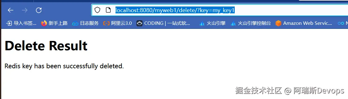 #一个 HTTP GET 请求,路径为 /myweb1/delete/,参数为 key=my_key1,验证确实删除了redis的key,此方法可用于CICD的接口操作做一下操作不仅限于redis