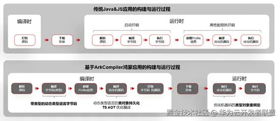 上图展示了传统的Java&JS应用构建运行与基于ArkCompiler鸿蒙应用构建运行的区别。核心是Compiler可以直接将字节码编译生成优化机器码,让应用启动即可运行高性能代码,提升应用启动和运行性能。