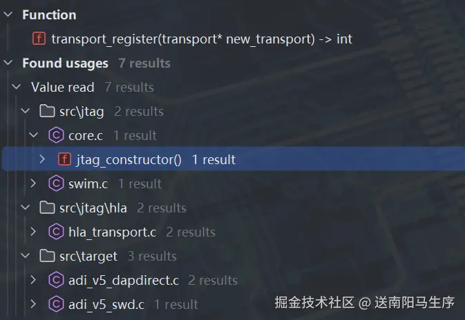 5)注:以下代码结构表示,在 GCC 中,项目启动时调用该函数,所以在 OpenOCD 启动时,这些 transport 将会被注册: