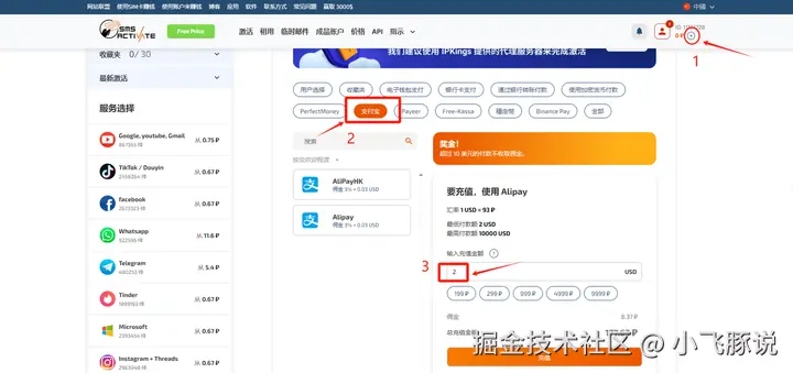 选择完电话号码后再点击右上角的【+号】,选择支付方式为【支付宝】,因为这里最少充值是2美刀,我们先充值2美刀。