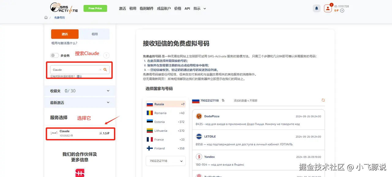 sms-activate.io/cn这个是需要收费的 ,不想用这个的,可以看后面Claude升级订阅部分,有提供海外手机号免费额度的使用方法。注册登录接码平台后,我们点击左边的【搜索框】,并输入【Claude】,最后选择Claude服务。