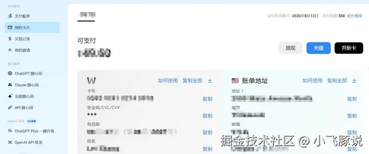 众所周知,国内的卡都是没法用的,所以这里用到的是wildcard,通过它就能拿到一张直接去订阅的支付卡,完成后面的订阅,不单只Claude,升级ChatGPT之类的也都能用。
