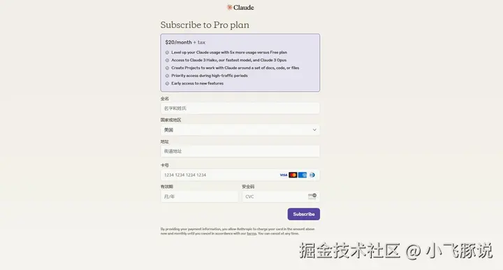 填写完成之后,就能正常完成订阅了,Claude会员现在是20美刀一个月,跟ChatGPT一样。