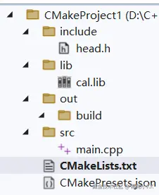 首先打开心爱的VS,然后我们选CMake工程,创建一个CMake工程项目。先清空一下自动生成的文件,然后添加一些目录与文件,工程结构如图所示: