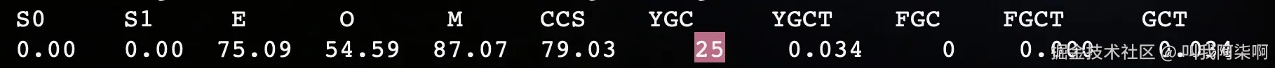 如图,共触发了25次YGC,因为字节数组b在创建之后,在后面没有被引用,所以当Eden满的时候,就会触发Young GC清理掉,从而不会进入S0、S1和老年代。