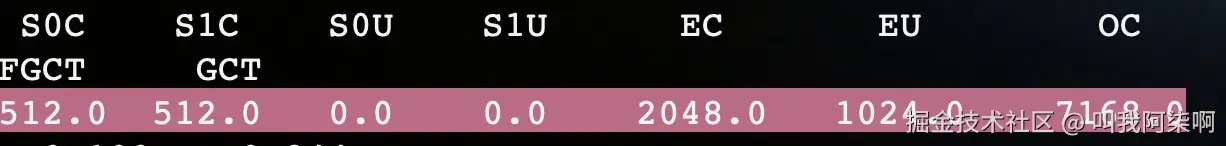 如图,以C结尾的表示capacity(容量),U表示used(已使用),单位为KB。从而可以看出Eden与S0、S1在年轻代的区域占比为4:1:1,可以通过 -XX:SurvivorRatio 来控制。