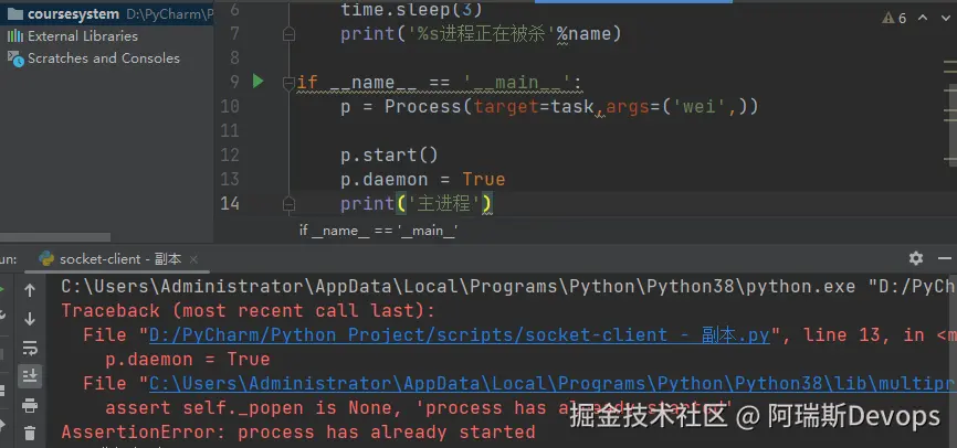 python 报错AssertionError: process has already started 阿瑞斯Devops 2024-09-28 19 阅读1分钟 python 报错AssertionError: process has already started 现象 python 报错AssertionError: process has already started 原因 在Python中设置守护进程daemon,一定要放在start方法上面才会有效 解决方法