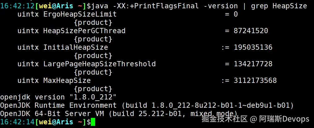 JVM 堆内存大小查看 阿瑞斯Devops 2024-09-28 118 阅读1分钟 JVM 堆内存大小查看 在默认不配置 JVM 堆内存大小的情况下,JVM 根据默认值来配置当前内存大小,可通过如下命令进行查看: java -XX:+PrintFlagsFinal -version | grep HeapSize 上图表示启动的 JVM 默认最大堆内存约为 2.9G,初始化大小为 195MB。