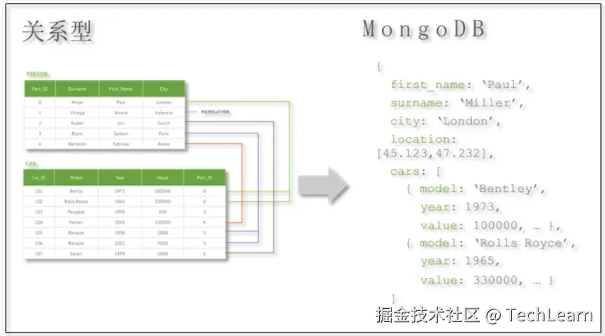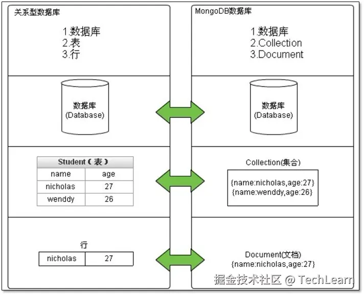 在传统的关系型数据库中,存储方式是以表的形式存放,而在MongoDB中,以文档的形式存在。