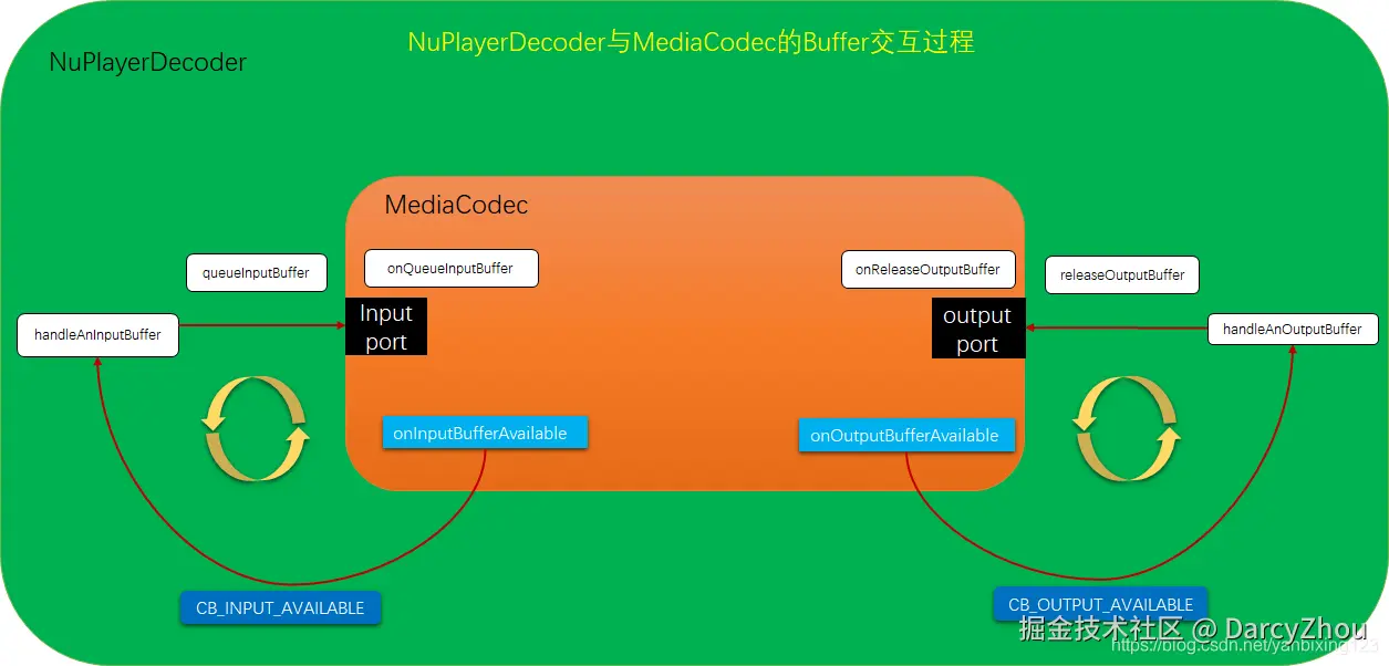 来看看下面这个图,NuPlayerDecoder是包装在MediaCodec外面的一层,而这个input和output都是相对于MediaCodec来说的,NuPlayerDecoder与MediaCodec交互发生在两个port,MediaCodec中也维护着一个BufferQueue,当inputport端口有buffer时,就会调用MediaCodec::onInputBufferAvailable()函数,这个函数就会发送一个CB_INPUT_AVAILABLE msg到NuPlayerDecoder中,通知它在MediaCodec的input port有一个buffer,那么NuPlayerDecoder就会相应的调用NuPlayer::Decoder::handleAnInputBuffer()函数来处理这个事情,怎么处理呢?MediaCodec的作用就是解码,Decoder就是从demux(MediaExtractor)中取数据,交给MediaCodec去处理。