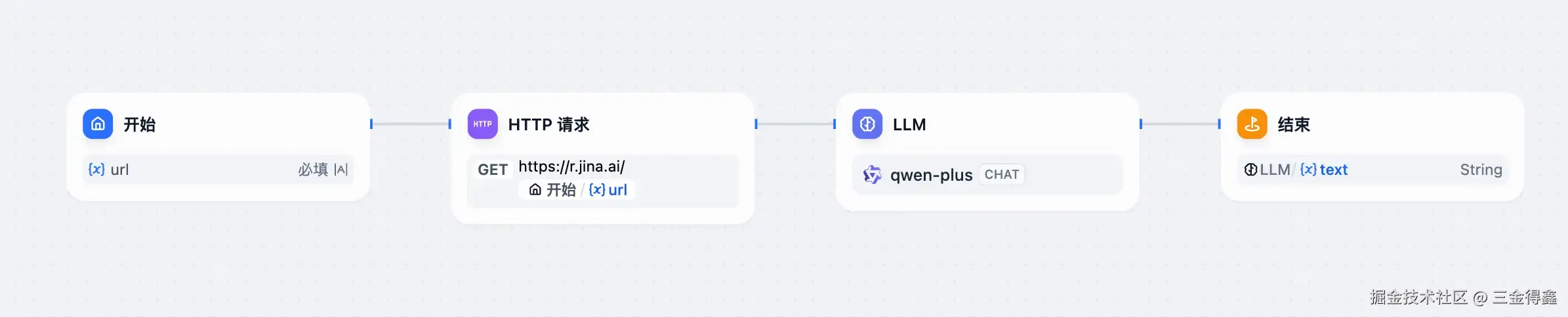 一种是使用线上服务,推荐 jina AI:https://r.jina.ai/,我们只需要在这个链接后面拼接上开始节点输入的 url 链接即可。