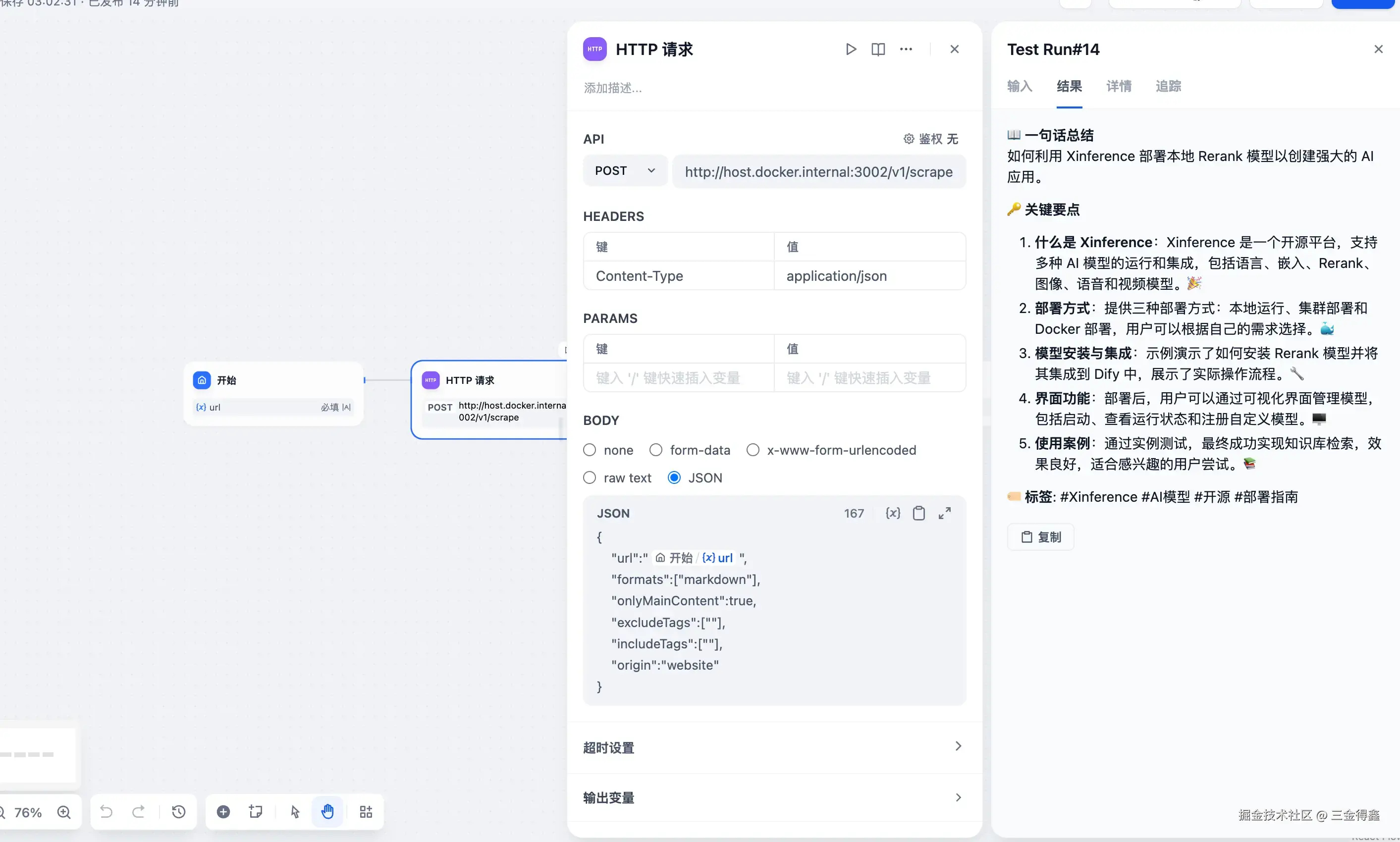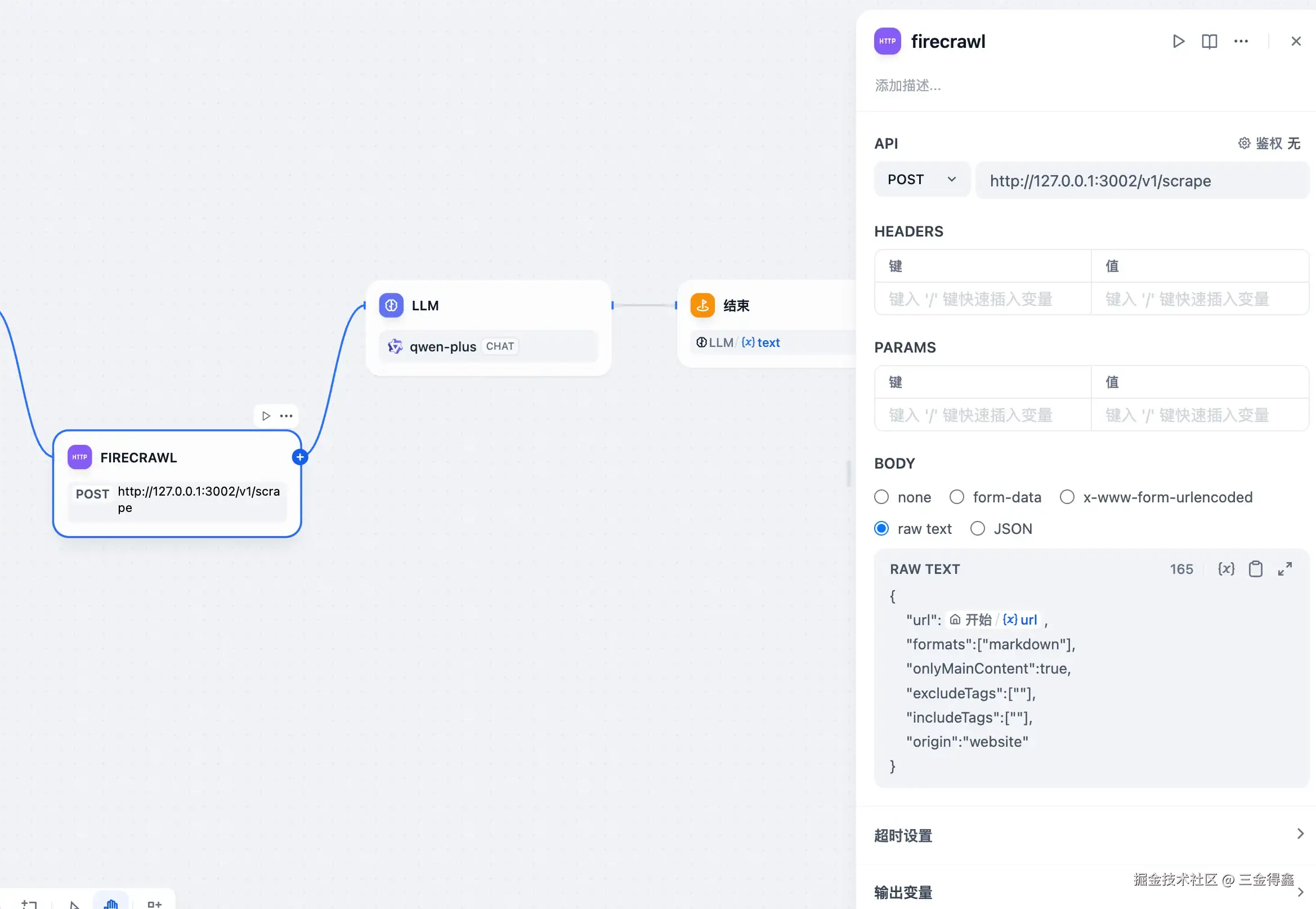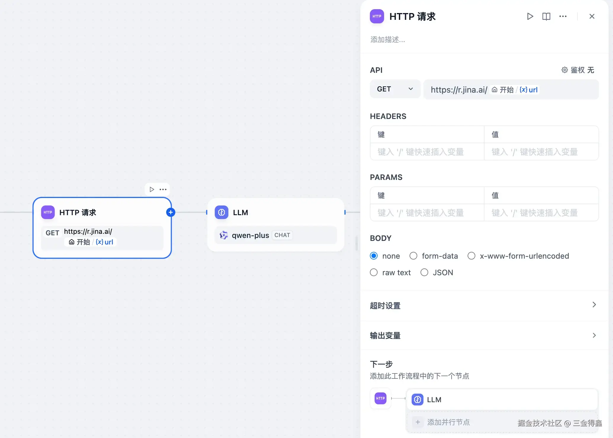 - HTTP 请求节点:这里可以通过之前我们部署的本地 firecrawl 服务来实现,也可以选择使用 jina 来实现,主要作用是爬取网页内容并将其转为 Markdown 格式;