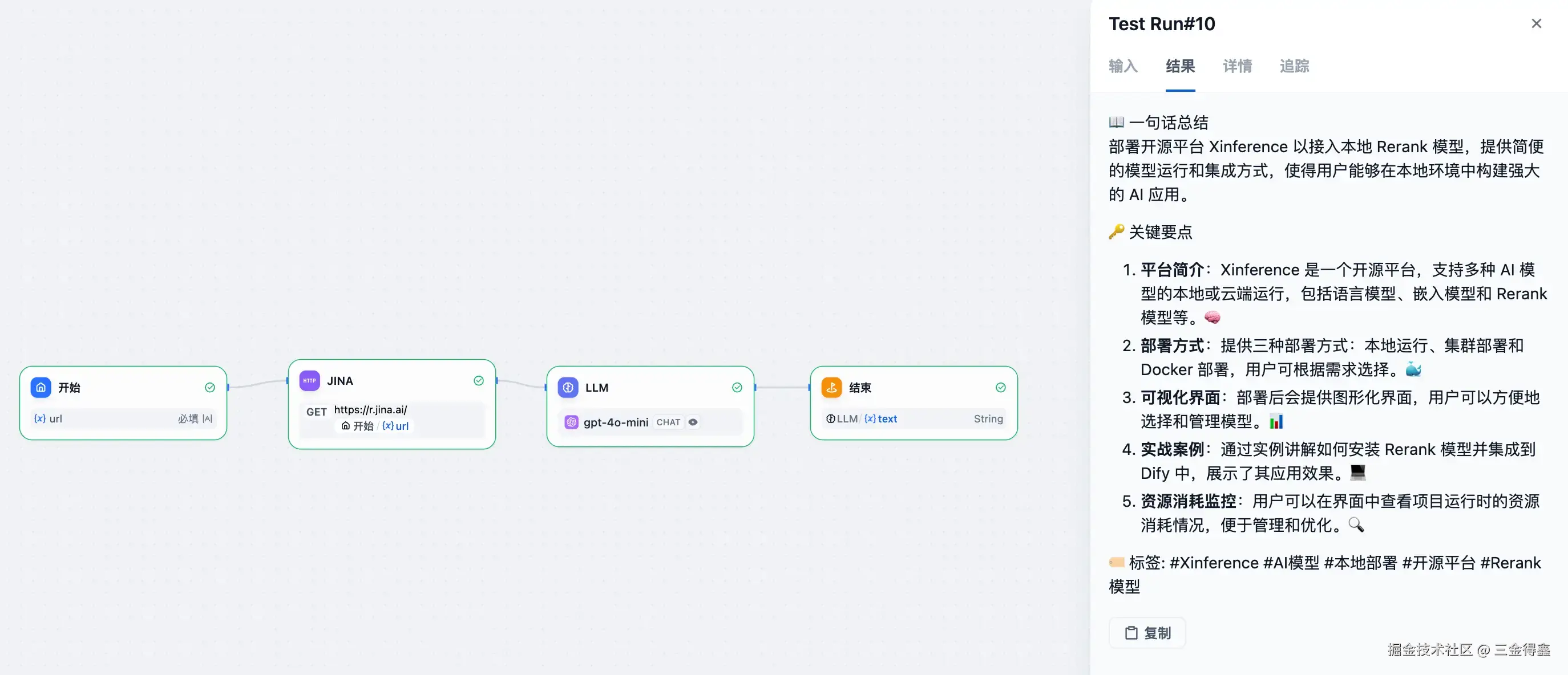 - 最后通过结束节点输出总结好的内容