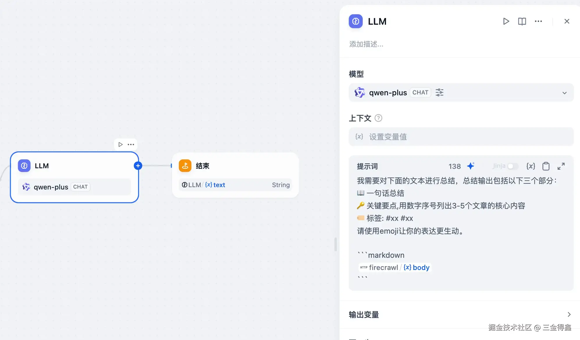 - LLM 节点:接收上一步传递过来的内容,并对其进行总结整理;